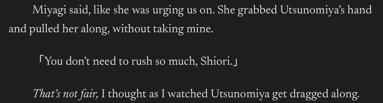 >>284698313>Most of my memories were tied to Sendai-san against my will, and no matter what I thought about, she surfaced instantly, like a switch being flipped. That was what made it so irritating—she intruded on my thoughts on her own, even when I wasn’t trying to think about her.She is too strong.