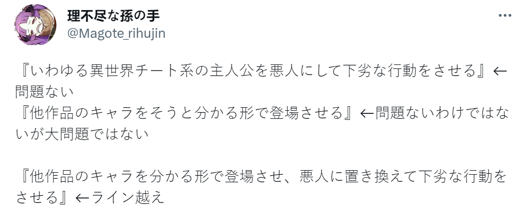 >>284718528>"'Making characters appear who are recognizably borrowed from characters from other works, and then turning them into villains and making them do vile things'. This is crossing the line"Keep in mind that if you havn't read Cheat Slayer, the first isekaijin who jobbed to the MC raped and murdered unapologetically for fun so it was obvious where this was going.