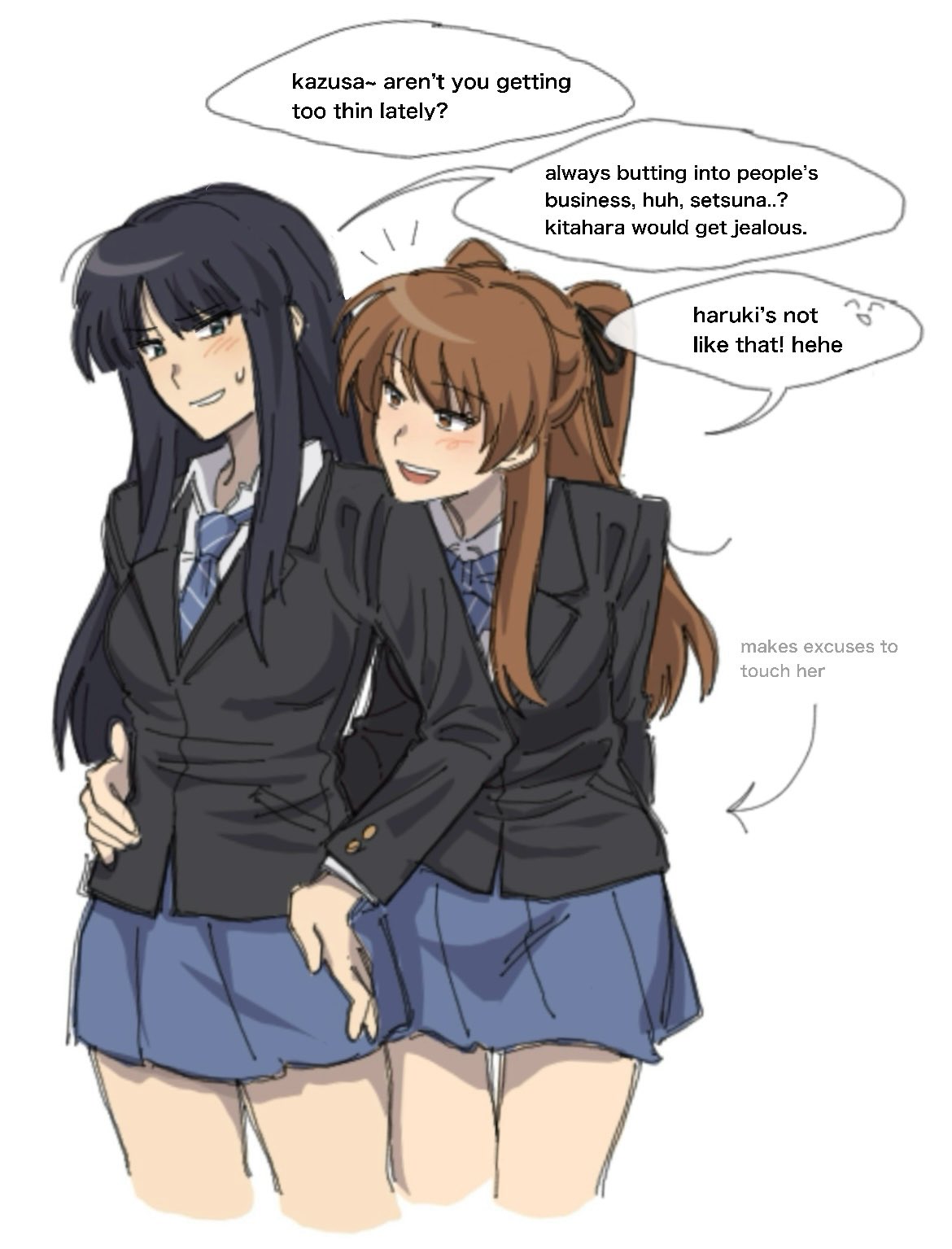 >>284724139You say it doesn't matter, yet you brought up as part of the cycle. Even if you ignore the author's comments, you describe their interactions as gay moments, so it's already beyond friendship. So it seems weird to complain to about to me, especially when you don't see the opposite behaviour from people who are satisfied with those moments, insisting that the yurifags who don't watch these shows are somehow lesser for it.