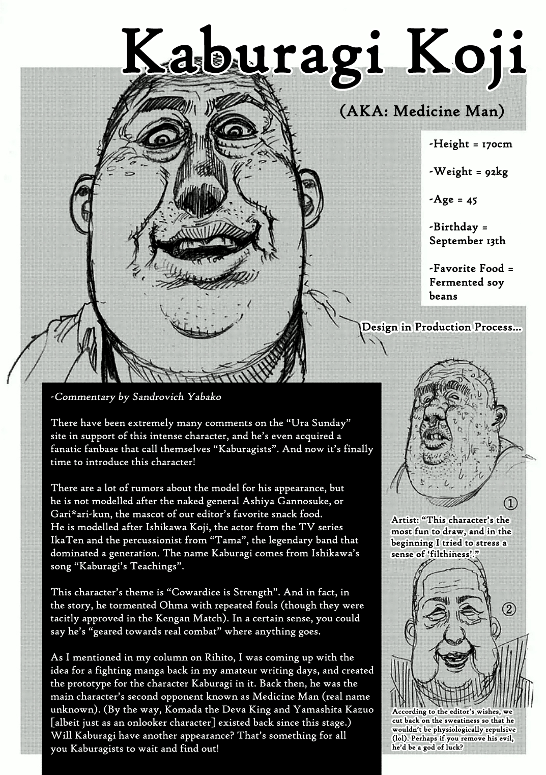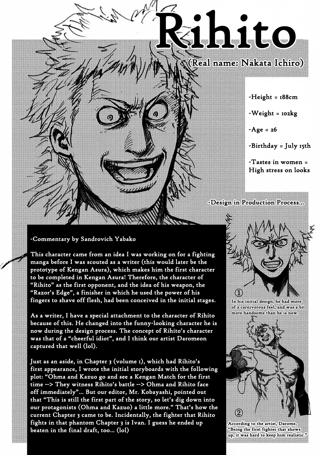 >>284738985Its hard to know where the line is for what is considered to be a spoiler. Important story events like Kazuo learning how to fight from Ohma and defeating the Deva king in his debut match is an obvious spoiler. General trends like knives being jobber weapons are a lot more iffy