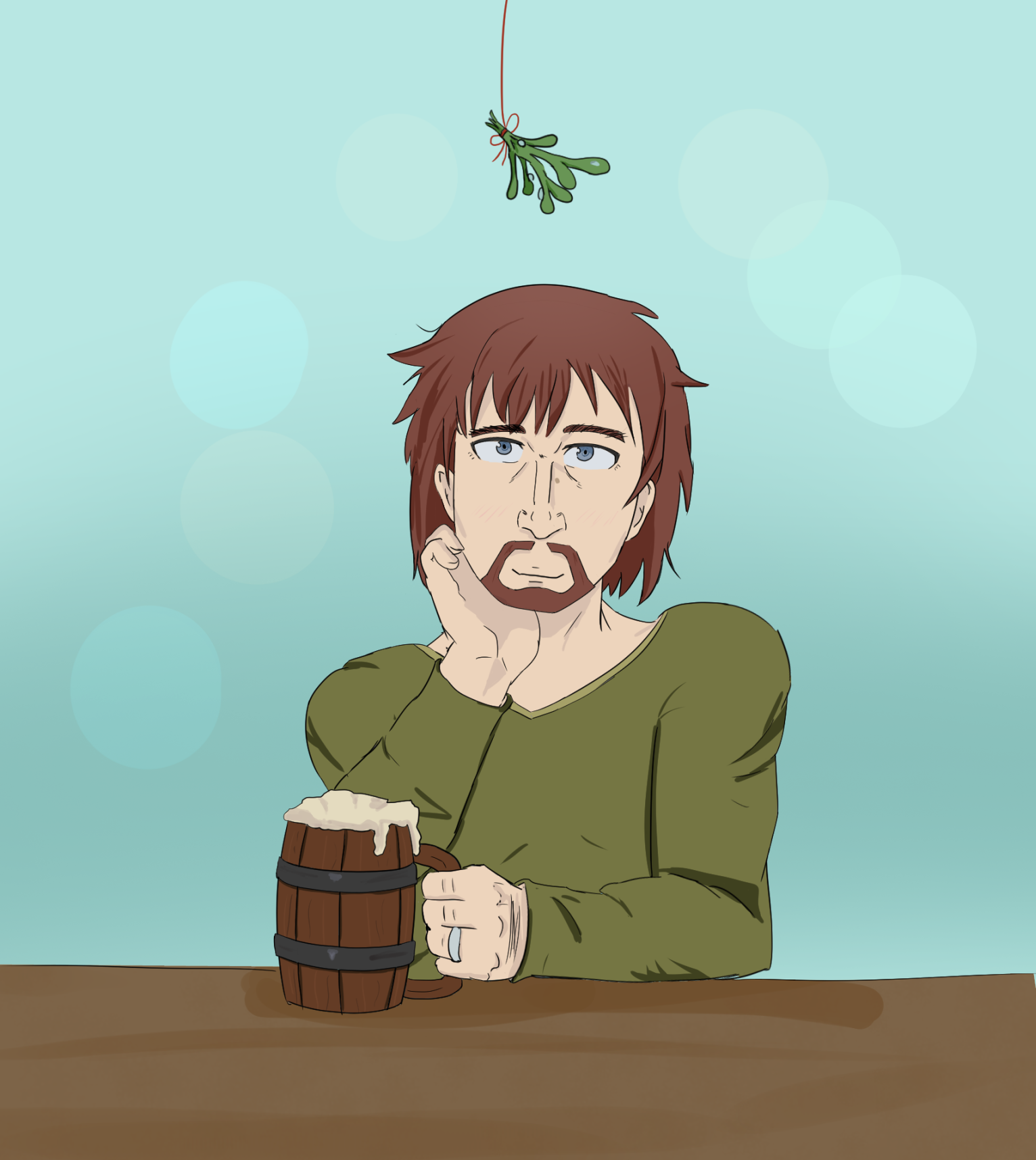 I want to thank the anon who is my Secret Santa! I actually don’t have any artwork of husbando under mistletoe so this felt very special! I appreciate you including details such as the hair on the back of his hands (I’ll always push the Einar body hair agenda till my last breath! I love my hairy man!) as well as those bushy brows of his (I’m really meticulous myself when I draw his brows. I draw each individual hair no matter how much it may hurt my wrists afterwards eheh). Thank you for also including him proudly showing off his wedding ring. This detail really sticks out while he holds his mug full of yummy booze! I also can’t get over that light flush on his cheeks as he smiles while looking upwards at the mistletoe, knowing the impending kiss that will surely come next. When my husband smiles and looks at ease, it has me feeling so warm in my chest. It reminds me how much I love him and how his happiness means the world to me. One of our love languages is spending quality time together, and you’ve captured this exactly.Thank you again for drawing my sweet Einar! hope that you have a lovely remainder of your holidays! Stay warm and stay safe!