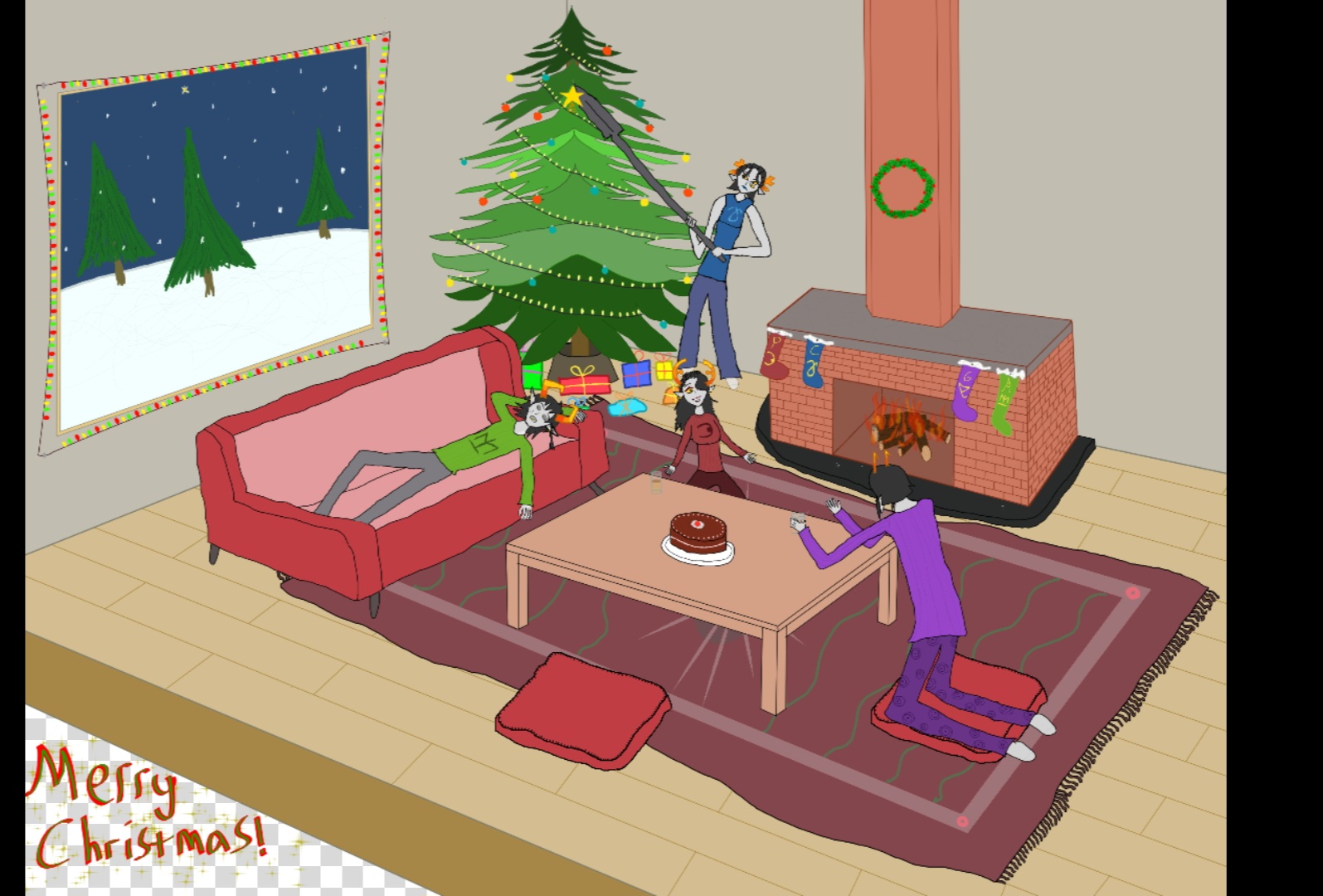 Thanks for very, very pretty drawing of her! And in quite heartwarming scenario too! She looks like she enjoys our time a lot too! Great background details make it look even better! Very festive and very colorful! and prominent rings are great and very welcome detail