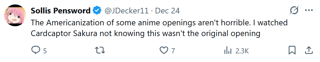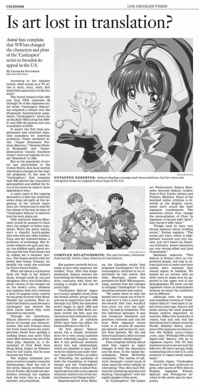 This is quite possibly the first time I've seen anyone claim that there's actual "nostalgia" for the hack Cardcaptors dub. Even at the time, the consensus seemed to be it was horrible, especially how they tried to edit it to elevate Syaoran to being an equal to Sakura (and failing miserably despite their best efforts).