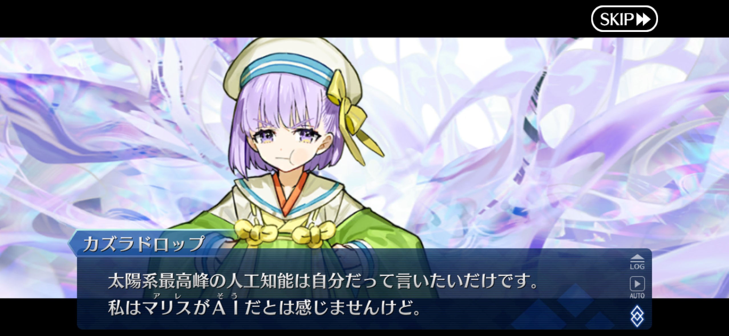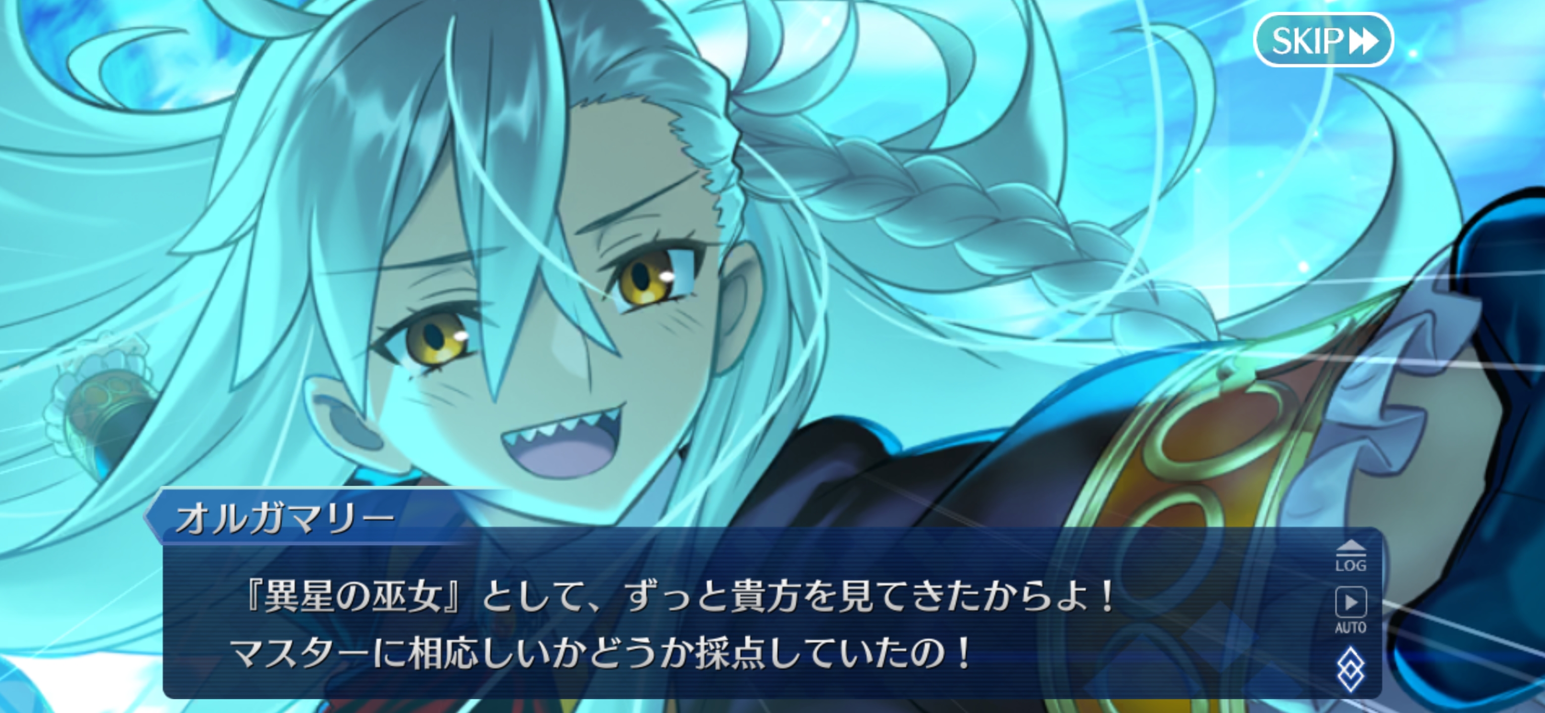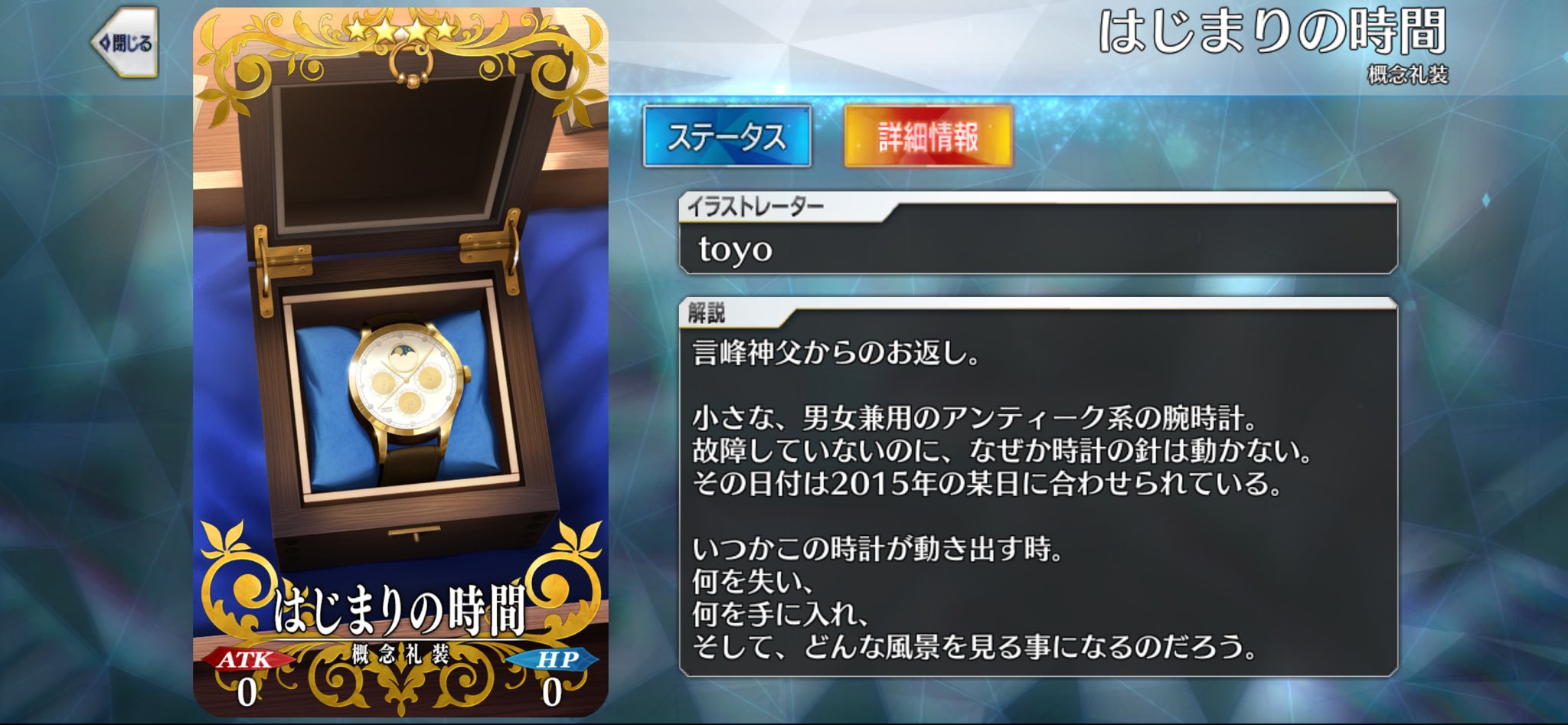 >That's right. I've been waiting for the right occasion to give it to you.>I know most people are content to use their phones for this nowadays, but there's still something special about a dedicated timepiece.>Though the passage of time may be unyielding, we can still stop it or recover it, depending on how we think about it.>As Tezcatlipoca might say......we do not consume time; rather, it flows on its own. We are just a single factor in its passing.>In a sufficiently large river, it is possible to remain in place within the current, or even to go against it.>Though of course, such a feat is still a long ways off for humankind.>Guda: Hang on. It looks like this watch doesn't work.>Indeed not. It's stopped. It hasn't moved since a certain time on a certain date.>Perhaps you think you've received a broken gift? That a watch that can't keep time is worthless?>Well, in my opinion, the present is not the only time that people should check.>Remembering what happened at a point in the past and what could have been done since then...>...is an essential part of the human experience as well.>If it helps, think of it as a good luck charm.Nasu is coocking.