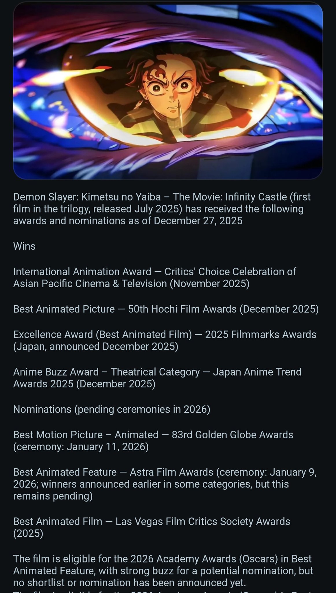 >>284818966No one cares about a bunch of regional Japanese awards. Likewise, awards analysts don't care about the Astra Awards or Golden Globes. The former got kicked out of Critics Choice Association due to controversy. Golden Globes too was surrounded by controversy and they're still recovering from the 2021 scandal. Their voting body is also small and has 300+ members of international journalists who don't even work in the industry. For comparison, the Academy has 10,000+ members and BAFTA has 8,000+, both of whose voters work in the industry.Las Vegas Film Critics is one small regional group of 20 members and it didn't win there either. KPop Demon Hunters won. Actually, Demon Slayer got ignored by EVERY critics group imaginable except for the Las Vegas one.Eligible doesn't mean nominated either. There's no such thing as a shortlist for Best Animated Feature at the Oscars. You either get nominated or you don't. It won't since the Oscars dislikes most anime that's not Miyazaki or Miyazaki-adjacent. KPop Demon Hunters, Arco, Little Amelie and Elio are the general consensus.