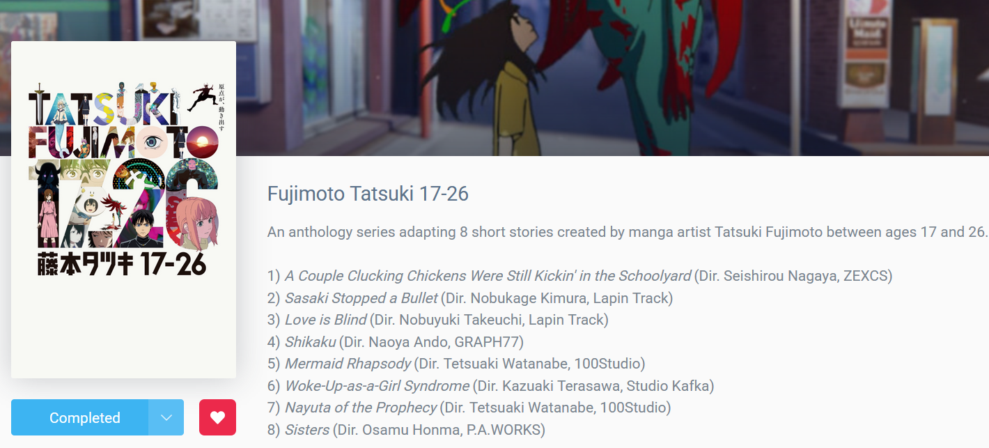 >>284835560Why is “Fujimoto Tatsuki 17-26” listed under TV show if they are individual episodes of OVAs?It was even shown in theaters and film festivals, so Anilist classified it as a movie. But no one classified it as a TV show.“Fujimoto Tatsuki 17-26” is very good and is taking away a spot from another series in the TV shows section. When it shouldn't have been in the TV shows section.I think it would be better in the OVAs or Movies section.