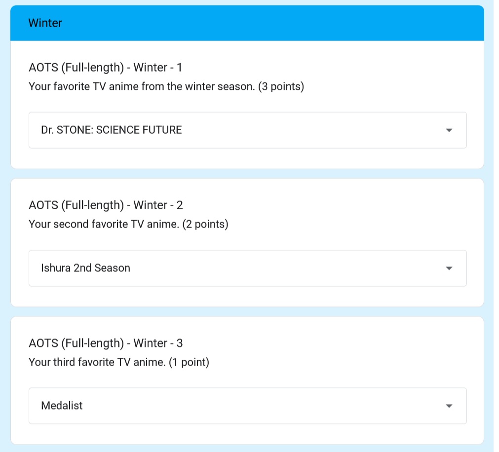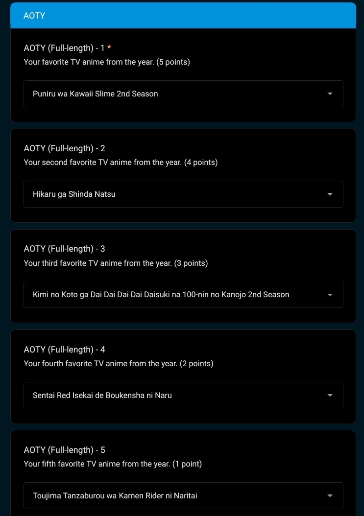 The last of this season's shows are coming to an end, and with them the 2025 anime year will come to a close. Now it's time to look back on the year and remember what we liked, what we hated, and how shit our collective taste was before 2026 rolls around and we do it all over again.Categories include best anime, worst anime, most surprising anime, most disappointing anime, best OP, best ED, best OST, best scene, best girl, best boy, best seiyuu, shows watched, and shows dropped.https://docs.google.com/forms/d/e/1FAIpQLSeuAFOWi1eG1SrnuhnCEp4a6sNsajbxzUING1QMnmEMmPOKew/viewform