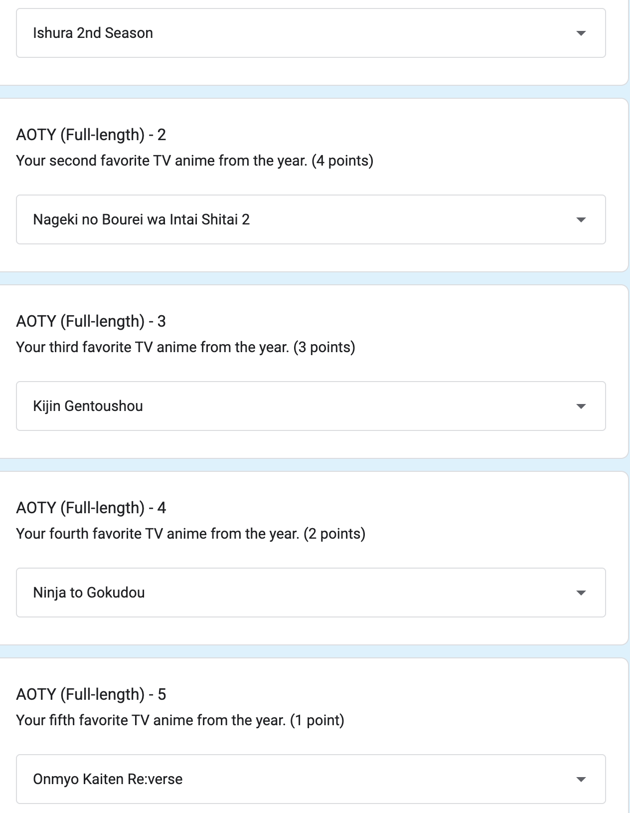 >>284858544yeah, which is what I keep criticizing about these pollsI still haven't seen a justification for doing the voting for an ongoing show then excluding it during the year it finishes