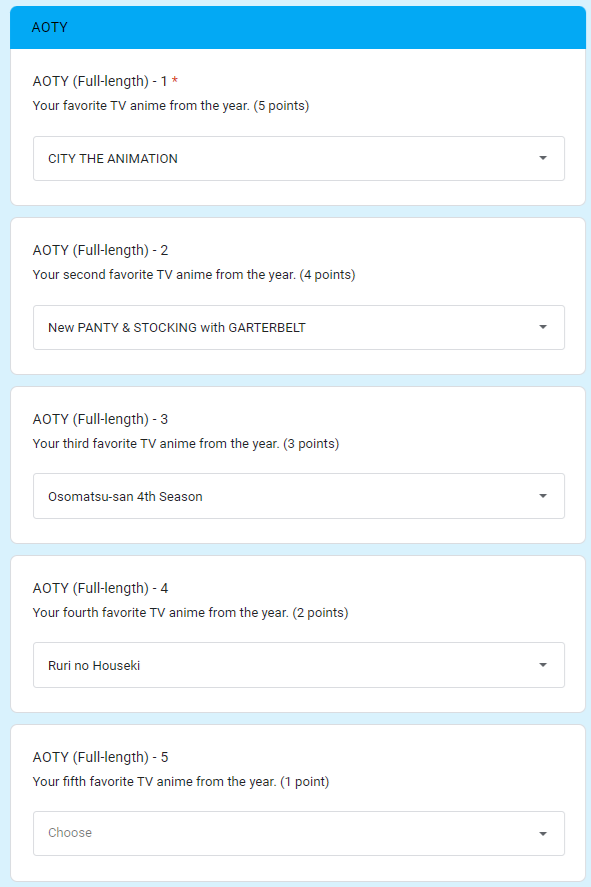 >>284836874There were several categories that didn't exist in 2015 so the blank spots in the thing that would have been in that category with the most votes. Saitama was voted best girl by several people. The full sheet is at: https://docs.google.com/spreadsheets/d/1R0y638s5zsSVpbkFTuS_pIxaalzrsSpdqZY9qk1Qb38/edit?usp=sharing>>284843345It's 8 episodes with 18 minutes in length according to AniList and it was streamed on Amazon as a series. It's certainly a weird case, but the episode count and length make it closer to the other full-length shows than to anything else. Lots of shows get theatrical previews/releases despite being made in the traditional episode format, so that can't really be the only factor.