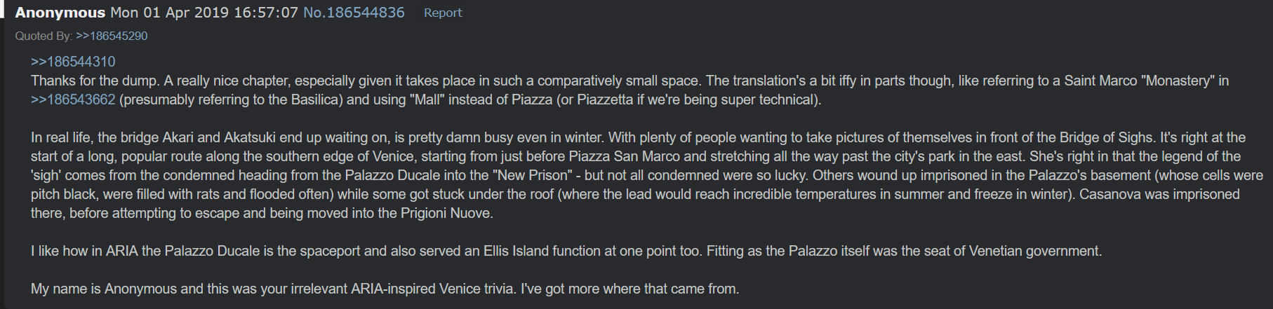 >>284974211Thanks OP. >Do you people watch?I'd look like a stalker if I did. An addendum to >>284982105 from the same thread as the pic: There's also mention of the 'Clock tower' and 'Bell tower'. The former probably refers to St. Mark's Clocktower, the 24 hour astronomical clock at the eastern end of the Procurative Vecchie, and the latter is meant to refer to the Campanile.The lion statue on the column that Akatsuki finds kinship with is a bit of a mystery. In reality it's meant to be seen as a winged lion but it's actually speculated to be a winged dragon statue brought from the far east. Its partner column has the figure of San Theodoro (standing on a crocodile no less), Venice's original patron saint before the more prestigious San Marco came in. (If you want a closer look at this statue, a replica is present in the courtyard of the Palazzo Ducale).