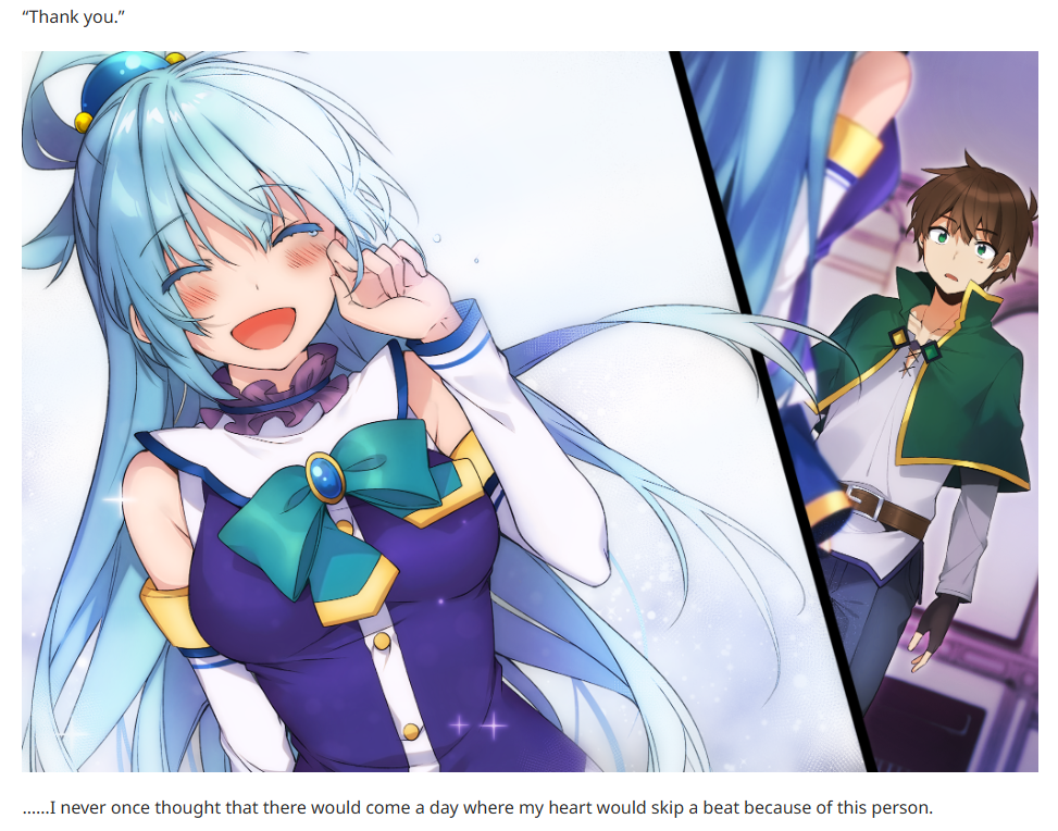 >>284872791The only moment in LN that could be ever seen as anything deeper between them is at the very last fucking sentence of the last novel before the epilogue. As opposed to a dozen of much more straightforward moments and comments with Megumin, Darkness, or even fucking Iris.I get that Aqua is hot and funny, but people really project hard whenever they pretend her and Kazuma ever had anything going.