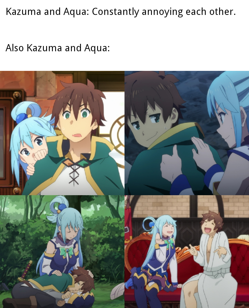 >>284872084Aqua and Kazuma are effectively siblings. They shittalk each other relentlessly, fuck with each other, but will support each other when the chips are down.
