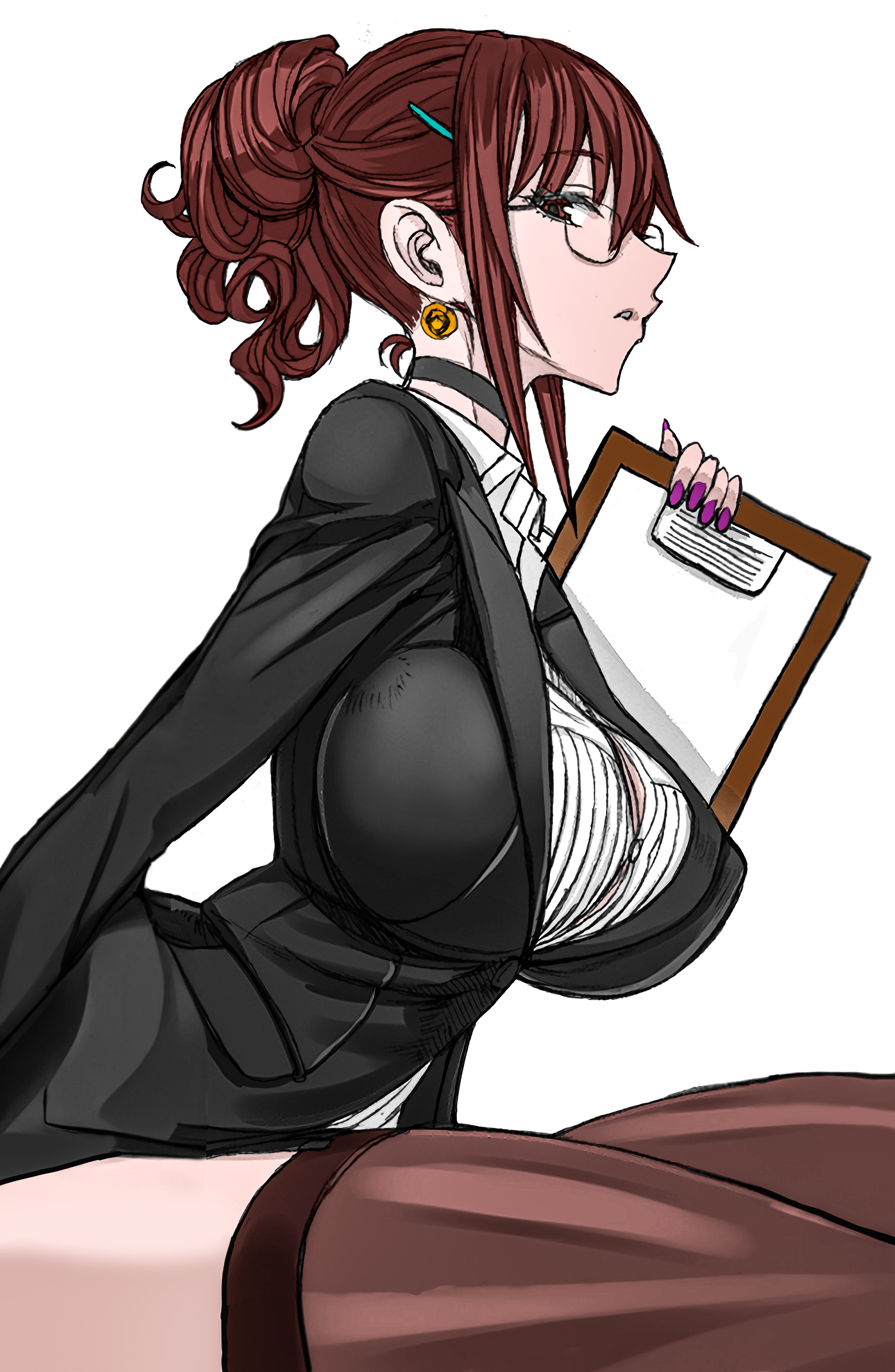 Requesting Mami bending over and showing off her pantyhose ass and thighs while giving the viewer a lewd and smug look, perhaps while leaning over a table and resting her face on her arms. Extralewd; make her nopan under her pantyhose and maybe even visibly wet, maybe some slight hint of blonde bush too.
