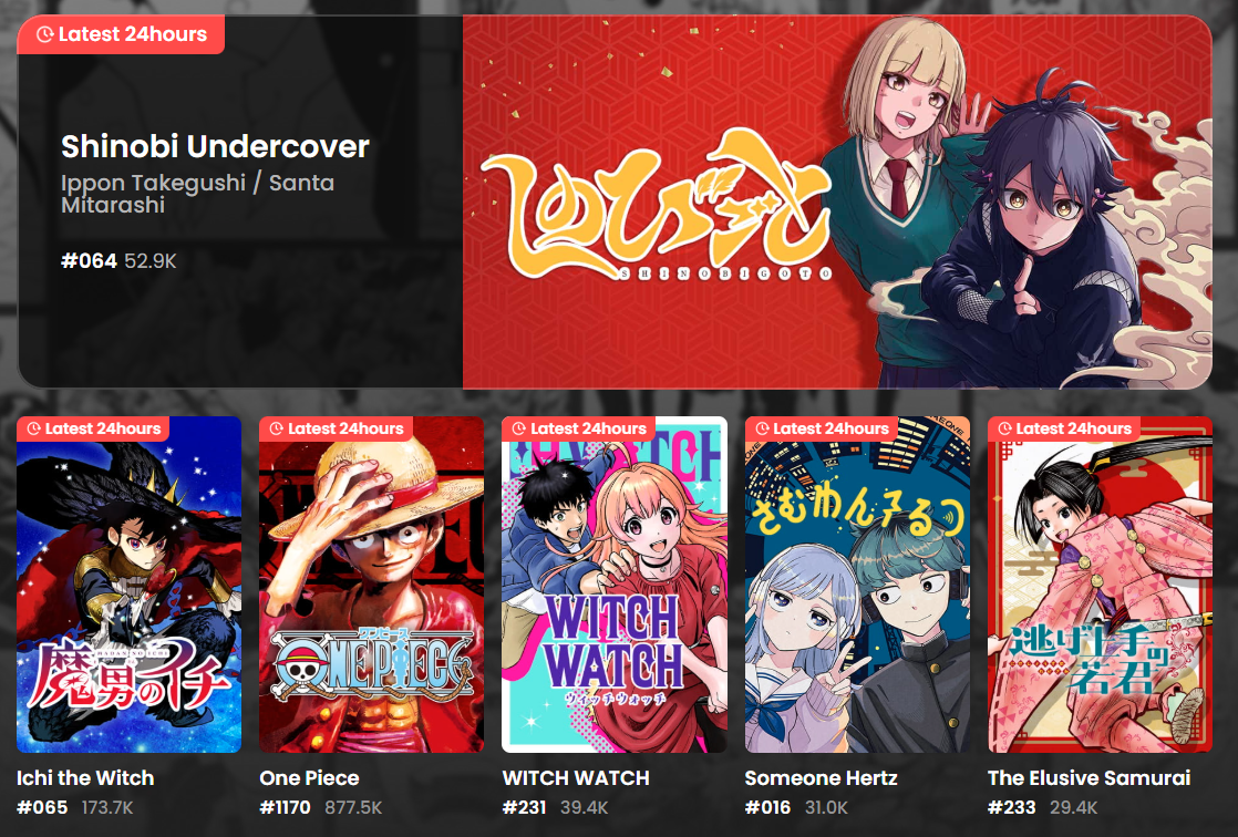 Shoseki Top 500 (January 1)19. Blue Box #2322. Sakamoto Days #2539. Ichi the Witch #6230. Witch Watch #24241. The Elusive Samurai #23Shoseki Top 500 (January 2)17. Blue Box #2320. Sakamoto Days #2544. Ichi the Witch #6380. Witch Watch #24437. The Elusive Samurai #23Shoseki Top 500 (January 3)16. Blue Box #2321. Sakamoto Days #2548. Ichi the Witch #6275. The Elusive Samurai #23280. Witch Watch #24