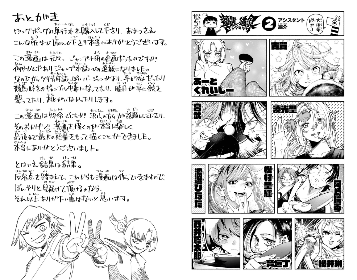 >>285048152In addition to what >>285046859 mentioned from the afterword, it seems the original plan was for it to be darker and more of a seinen. Taira would be an adult, Momo wouldn't exist, and Mutsuki would be a degenerate gambling (horse racing specifically) addict. The page on the right seems to be illustrations from everyone who contributed as an assistant, there's a lot surprisingly. I'm not familiar with most of these names (bottom right is Rin Matsui), but funnily enough, bottom left is the artist from Embers. Seems like he's back to working as an assistant now.