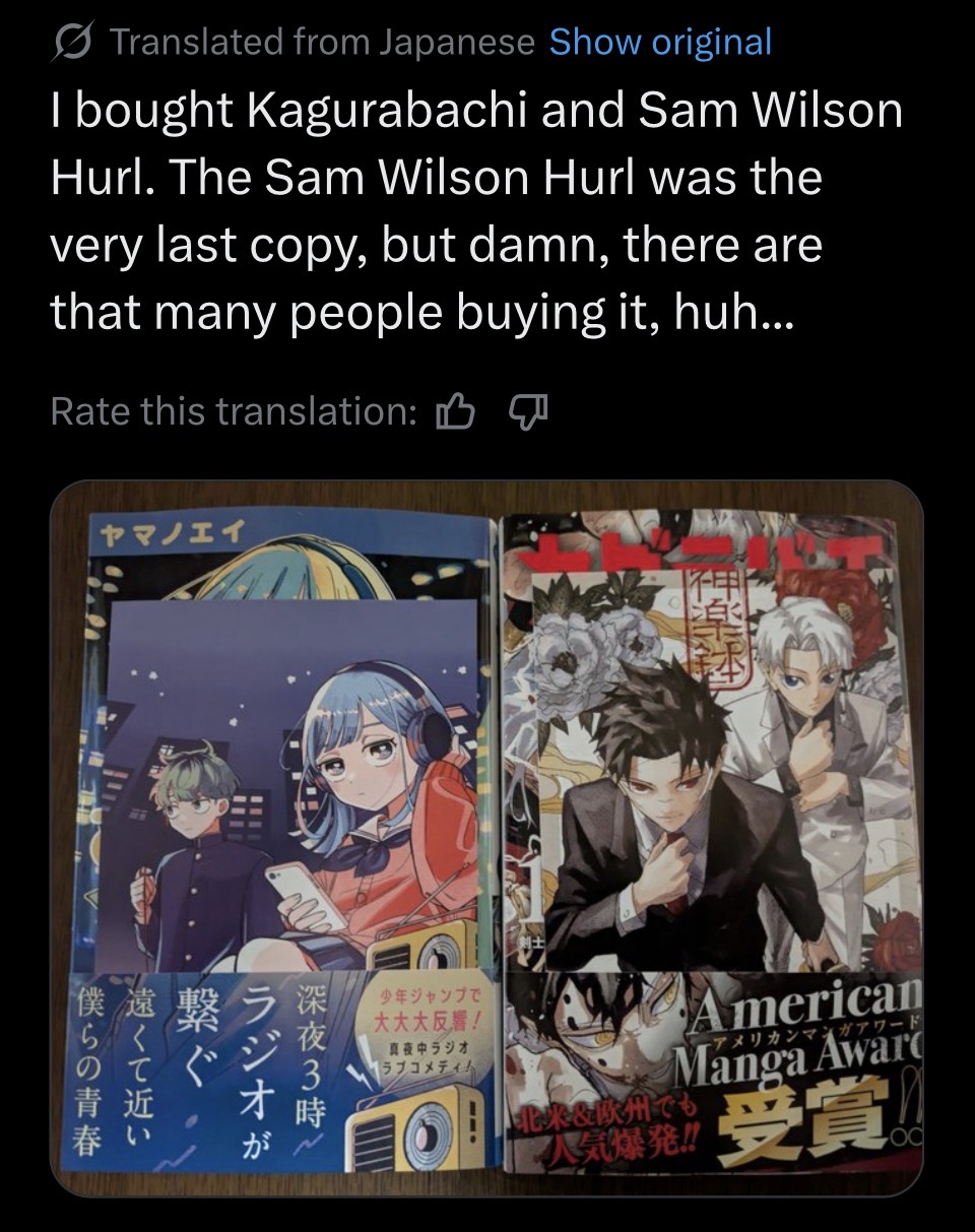 >>285052432Daily reminder that after 2 years Kagurabachi only has 3 million copies in circulation, which is 8 times lower than Black Clover's numbers.Big, very big, sad.