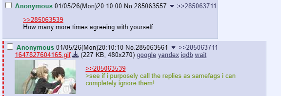 >>285063539>see if i purposely call the replies as samefags i can completely ignore them!