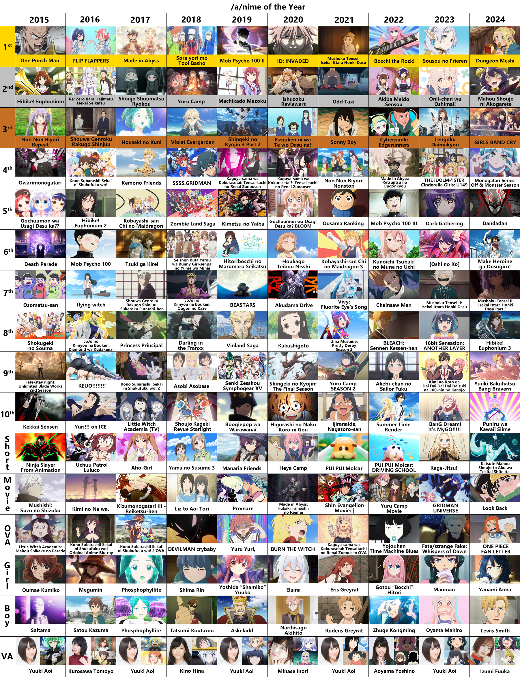 >>285172194My AOTY? One Piece (Fall). My #2? One Piece (Spring). #3, One Piece (Winter). #4, Doraemon (Spring). #5, One Piece (Summer).