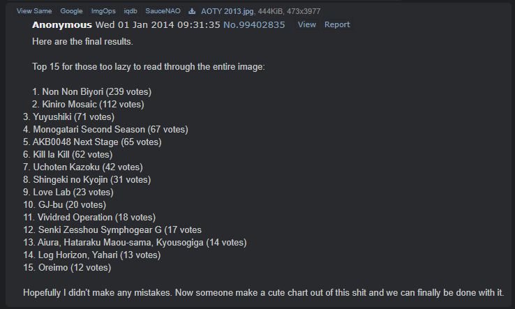 >>285172615>opening and endings are song + animation>so OP should count as ED when being played at the end of the epThey don't have new visuals when they play the OP at the end of the episode.>what about when they change the animation slightly, like OP having new characters in it? it's obviously different OP nowOPs and EDs are referred to with official names. And guess what? It's the name of the song. You're right that they're the song + visuals, and that includes visual differences between episodes. That's why, for example, Ninkoro's ED is praised, and that only works if you treat them as a collective instead of separate EDs. Of course, instead of following common sense, it's a far better option to arbitrarily exclude a subset of the year's OPs and EDs from being voted on.