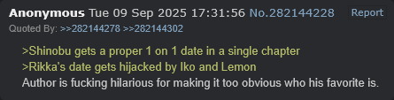 >>285097382Shinobu won. Boy do I feel so stupid. I really thought Iko and Nene had a chance. Now I’m forever Mr. Loser, outsmarted by Shinobu, now I’ll keep reading the next 100 chapters like a cucked loser desperate for my impression to be swayed, for someone to make me a winner. I can’t wait for the next harem romcom, this was supposed to be the one.