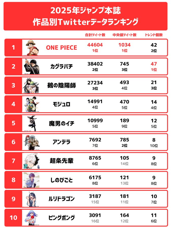 >Rakuten Physical Daily Rankings (Shonen)JJK Modulo #1 - 1Kagurabachi #10 - 4Akane-Banashi #20 - 10Someone Hertz #1 - 12Shinobi Undercover #6 - 32Hima-Ten #7 - 34Harukaze Mound and Ping Pong Peril are too far down to get accurate results without scrolling for ages>Amazon Ranking (Digital)JJK Modulo #1 - 1Kagurabachi #10 - 4Akane-Banashi #20 - 51Someone Hertz #1 - 89Hima-Ten #7 - 221Shinobi Undercover #6 - 337Ping-Pong Peril #2 - 1934Harukaze Mound #2 - 4662