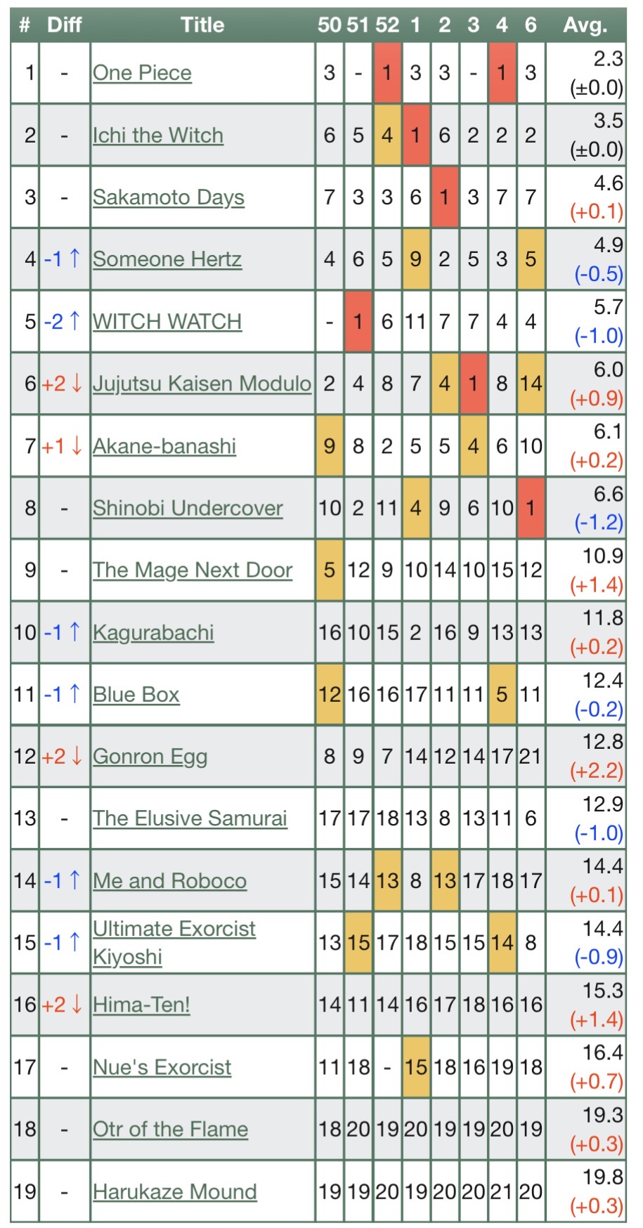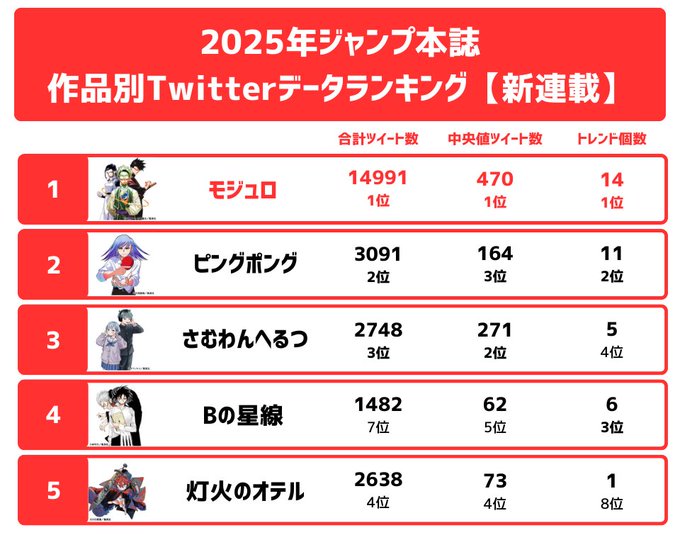 Shoseki Top 500 (January 5)1. Jujutsu Kaisen Modulo #12. Kagurabachi #106. Someone Hertz #17. Akane-banashi #2013. Shinobi Undercover #616. Hima-ten! #749. Harukaze Mound #270. Ping Pong Peril #2422. Ekiden Bros #2