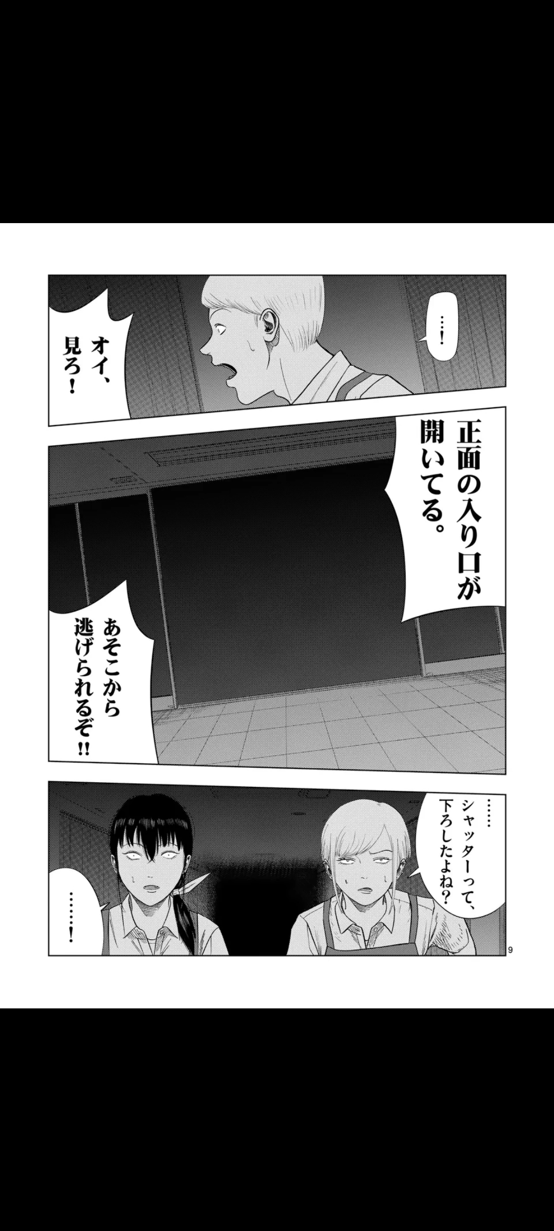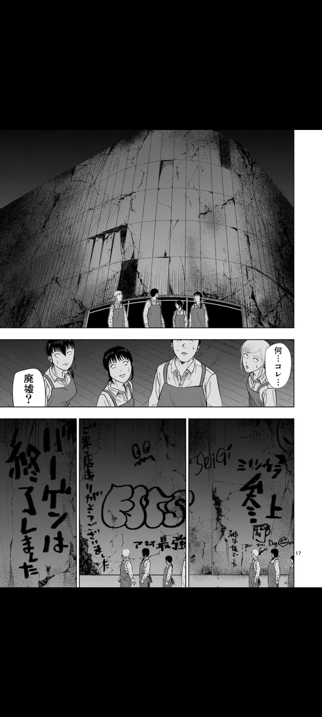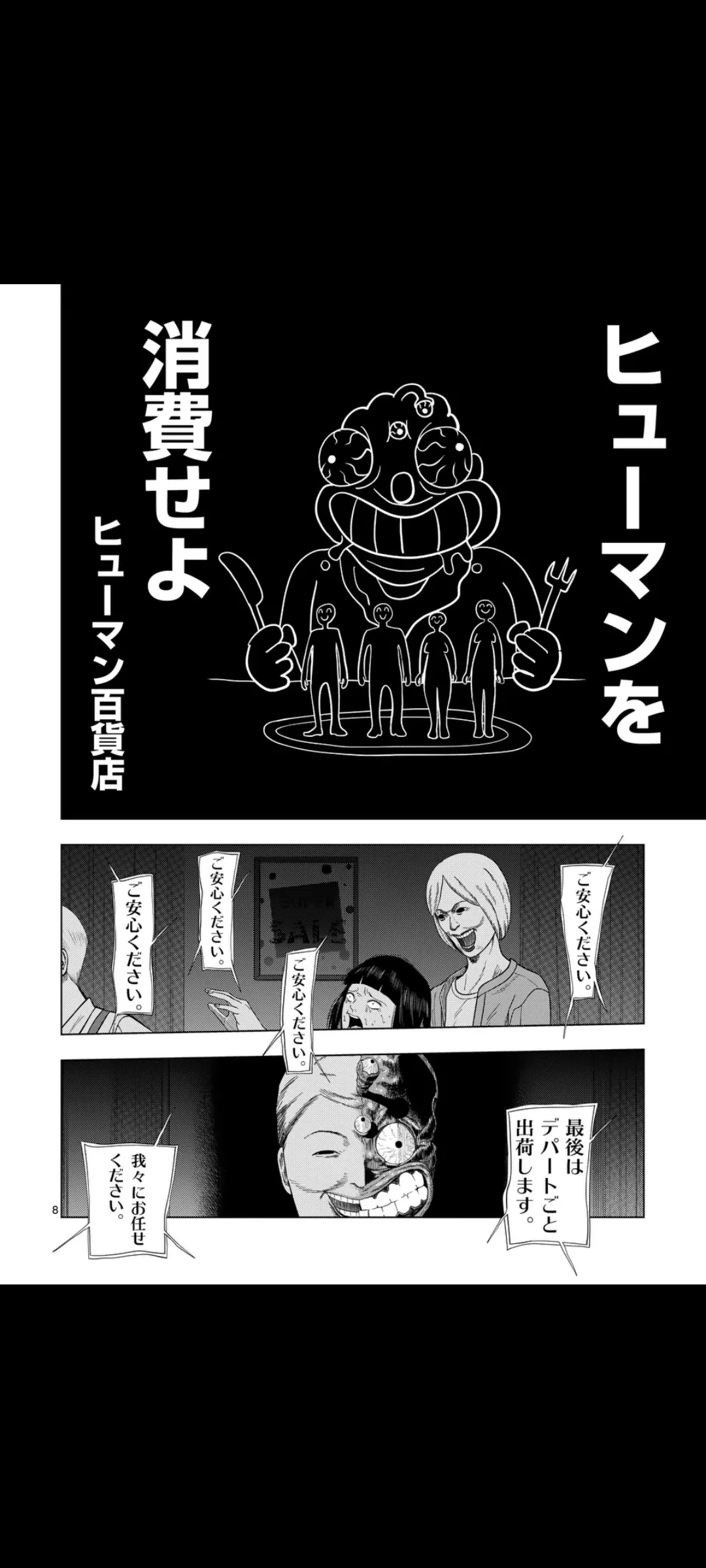 Turns out however, that the entrance doors are open, and that they can escape that way, but something's weird, the shutter should've been down. Yume screams that the doors stink, but it's too little too late. The others enter a vortex of some sort, ending up in the Monster Men's dimension, where they sell human delicacies.Their language, btw, is literally just "lolololololululululu" and stuff like that. From the looks of it, they're aliens.Yume, Hama, and a few others instead chose to hide away for now. However, a shadow draws near, thankfully, closing time arrives, and it has to go away.The group, now safe, moves toward the exit, where they find that the department store has been abandoned for who knows how long. Three graffiti stand out: "Thank you for coming to our store", "The bargain sale has ended", and "The next sale will be in a month".The ledger confirms this is their last job.That's it for now. Next chapter is next Friday.