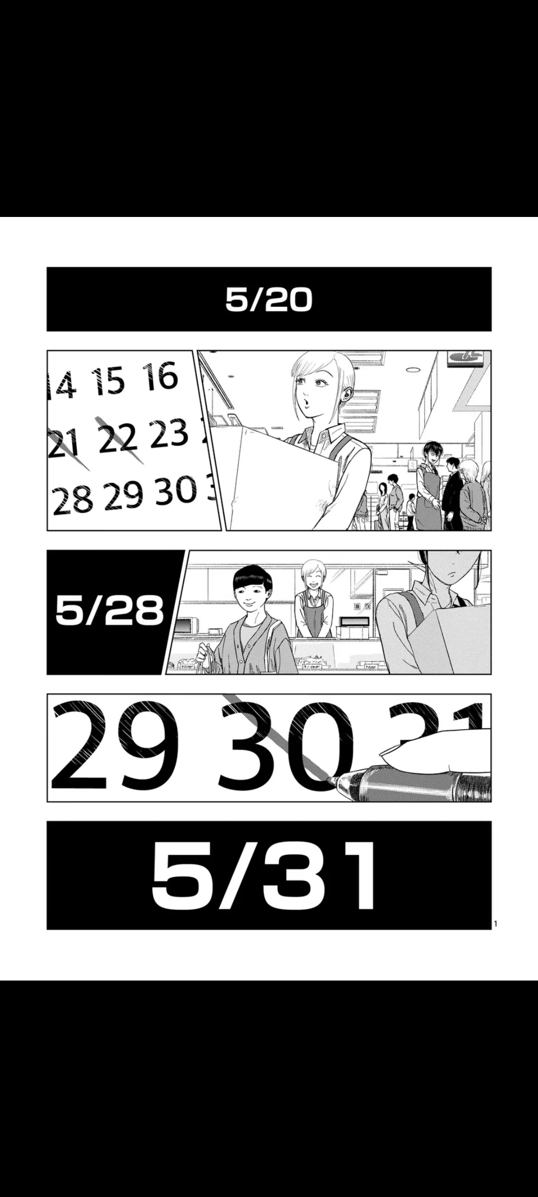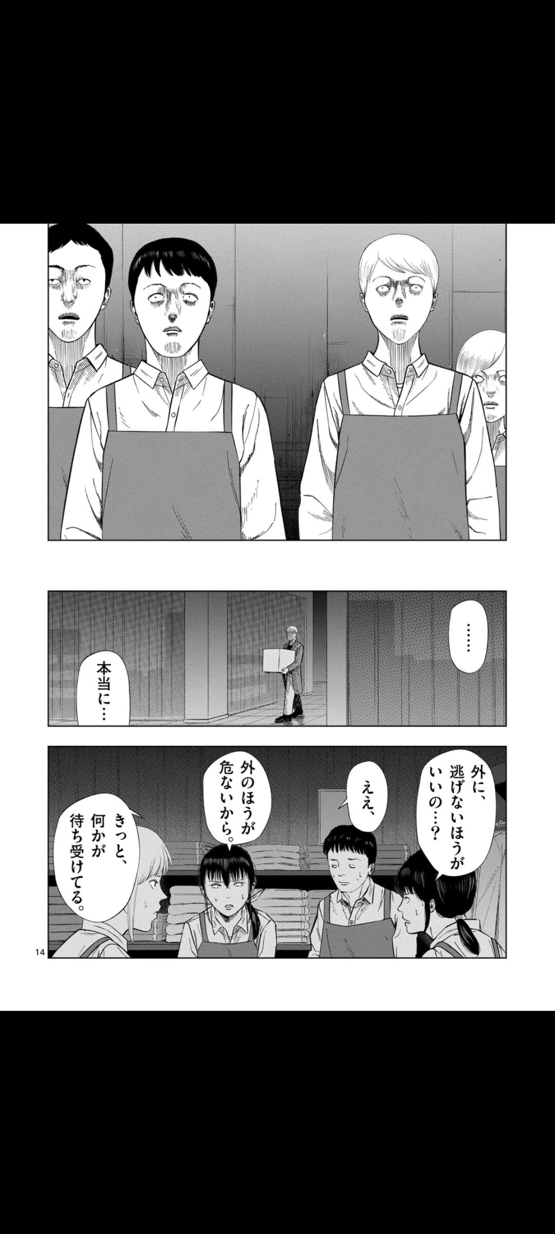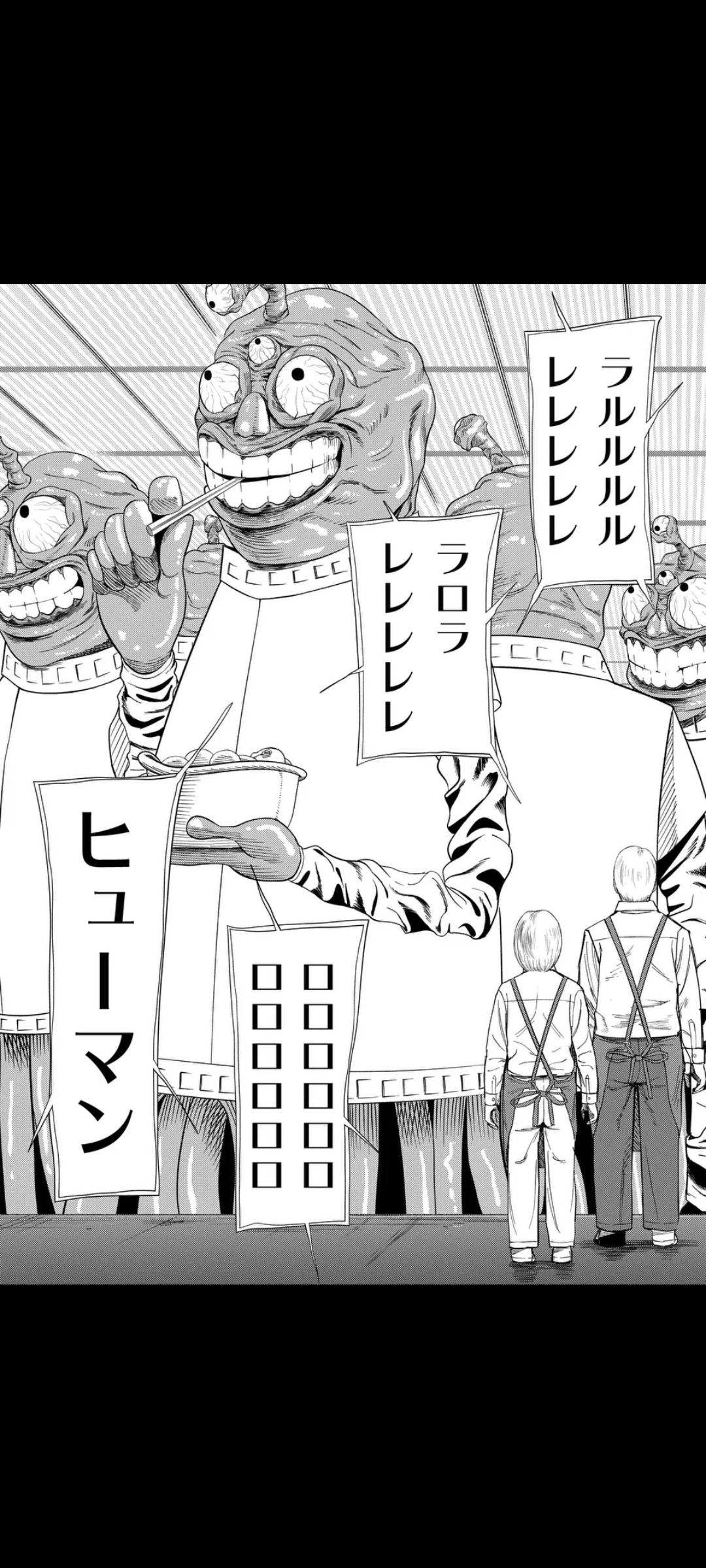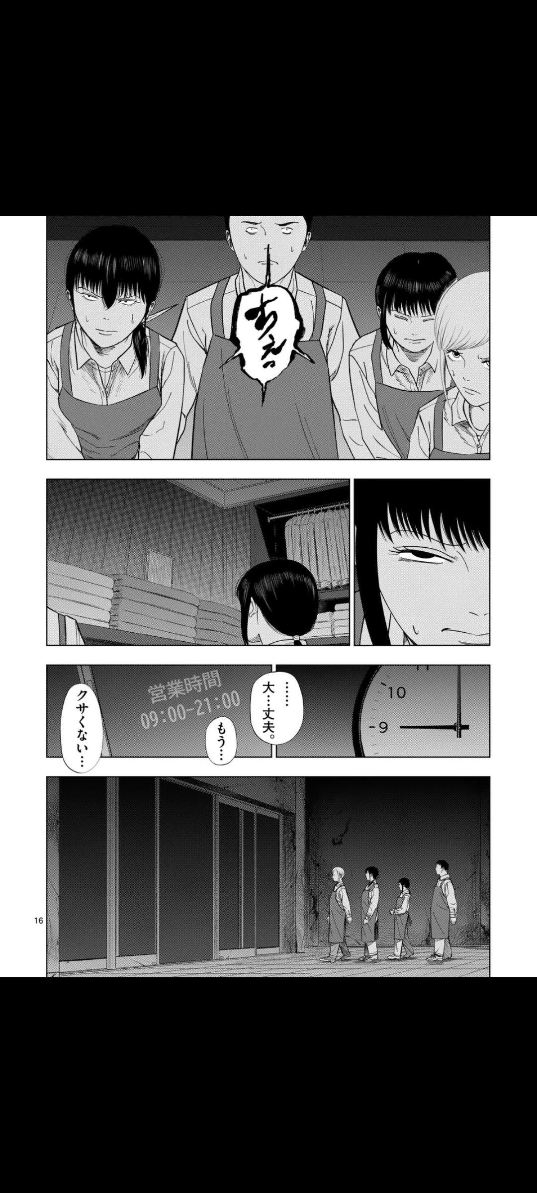 Turns out however, that the entrance doors are open, and that they can escape that way, but something's weird, the shutter should've been down. Yume screams that the doors stink, but it's too little too late. The others enter a vortex of some sort, ending up in the Monster Men's dimension, where they sell human delicacies.Their language, btw, is literally just "lolololololululululu" and stuff like that. From the looks of it, they're aliens.Yume, Hama, and a few others instead chose to hide away for now. However, a shadow draws near, thankfully, closing time arrives, and it has to go away.The group, now safe, moves toward the exit, where they find that the department store has been abandoned for who knows how long. Three graffiti stand out: "Thank you for coming to our store", "The bargain sale has ended", and "The next sale will be in a month".The ledger confirms this is their last job.That's it for now. Next chapter is next Friday.