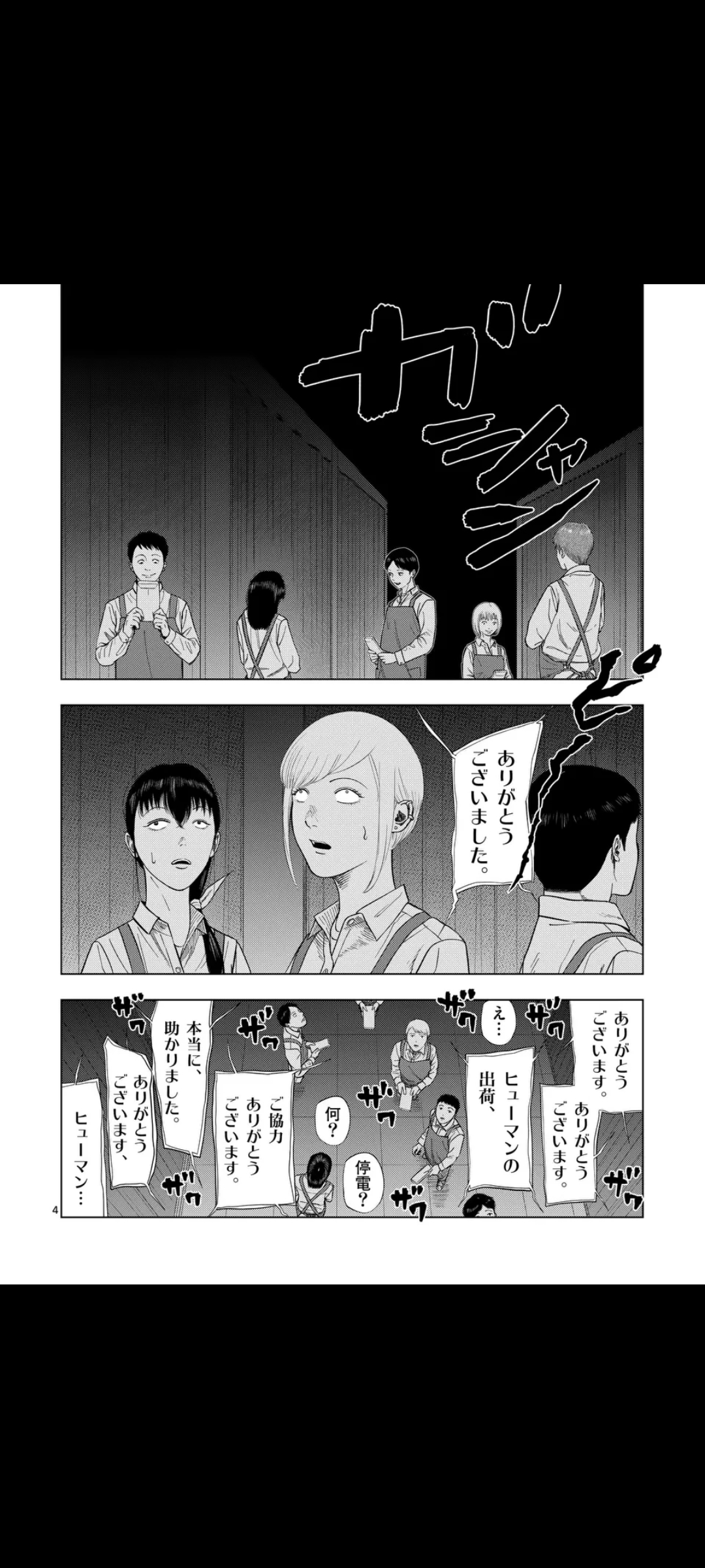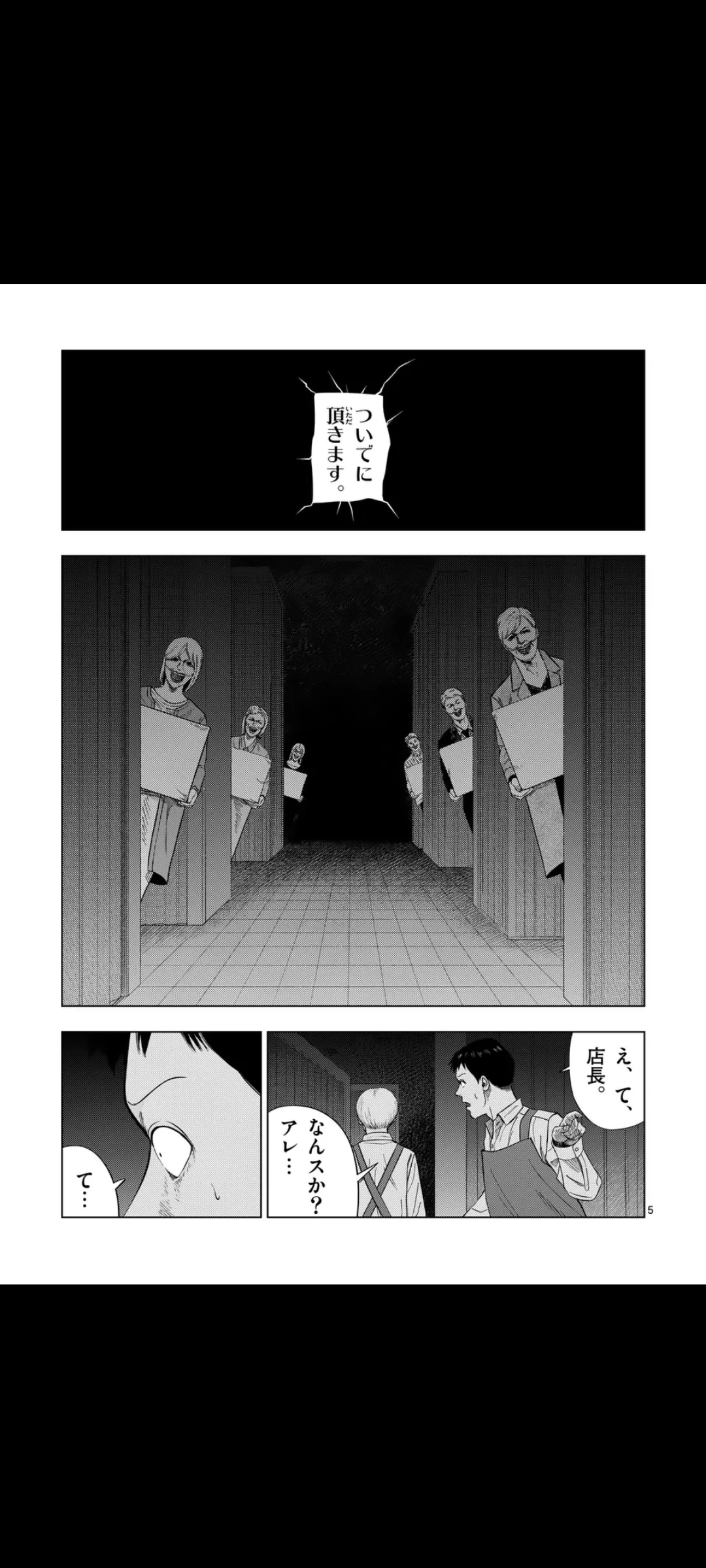 Summary time:A week passes without incident, and we're now at the last day of the sale. It seemingly goes without issue too, and the shop closes for the day.Afterwards, the employer congratulates the gray part-timers, offering his thanks for helping with their "shipments", only for all of them to suddenly be in a pitch-black area, seemingly due to a power outage.The employer, now a voice coming from speakers, reveals that the shipments were of humans after all, and that there still are a few to be collected.Suddenly popping out of the darkness are possessed (?) customers, each carrying a cardboard box. One of the part-timers asks the employer what's going on, whereupon he reveals his true form as the Monster Man.They all begin to run, but one is caught. The speaker voice then explains that they package humans "this way" (grabbing them and then entering the box) making it impossible for them to ship themselves.Finally, we learn what their goal is. They "consume" (literally and figuratively) humans at the "human department store". All that's left now is to ship "the entire department store", and you can leave that to them.Continued in another post.