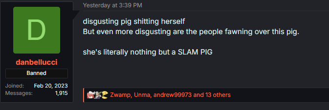 >fat>smelly>sits in her own shitShe is really, literally a pig, if you think about it. Somebody should draw her with ears and a snout and a tail. It'd be kino.