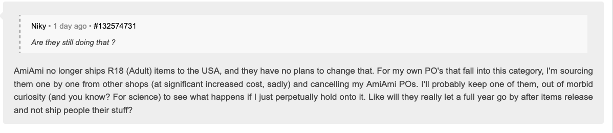 >>285150598I've cancelled quite a few times and never had any issues, pretty sure these people are constantly cancelling and preordering without actually buying anything which probably makes amico annoyed