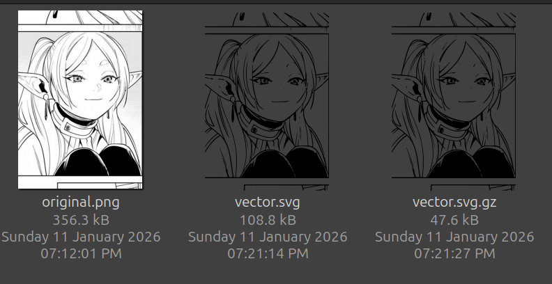 >>285203575I was thinking of a new more efficient vector based image format for sharing manga.Basically if you've ever used inkscape or a vector image editing program, you would know they can "trace" normal images and turn them into vectors.This means no matter how large or small your screen is, you will be able to view the manga page perfectly since its a vector now and can be scaled infinitely. Plus since its not a raster image, it will likely reduce in size as well