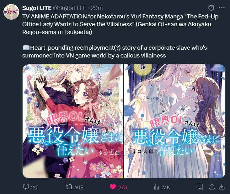 Yuri manga The Fed-Up Office Lady Wants to Serve the Villainess TV ANIME ADAPTATION announced