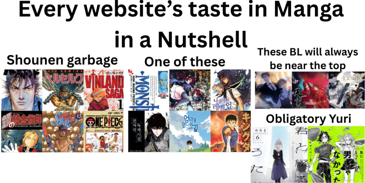 >>285183264>solo leveling>chinckshit>gookshit (how?)>poorly writen romance..BUT ITS YURI!>one piece>solo leveling Thats why i cant take mal seriously, are only kids and niche communities voting there??