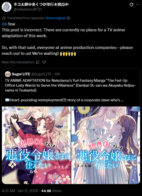 >>285204904https://twitter.com/nekotarou0721/status/2010295234270515695No anime.