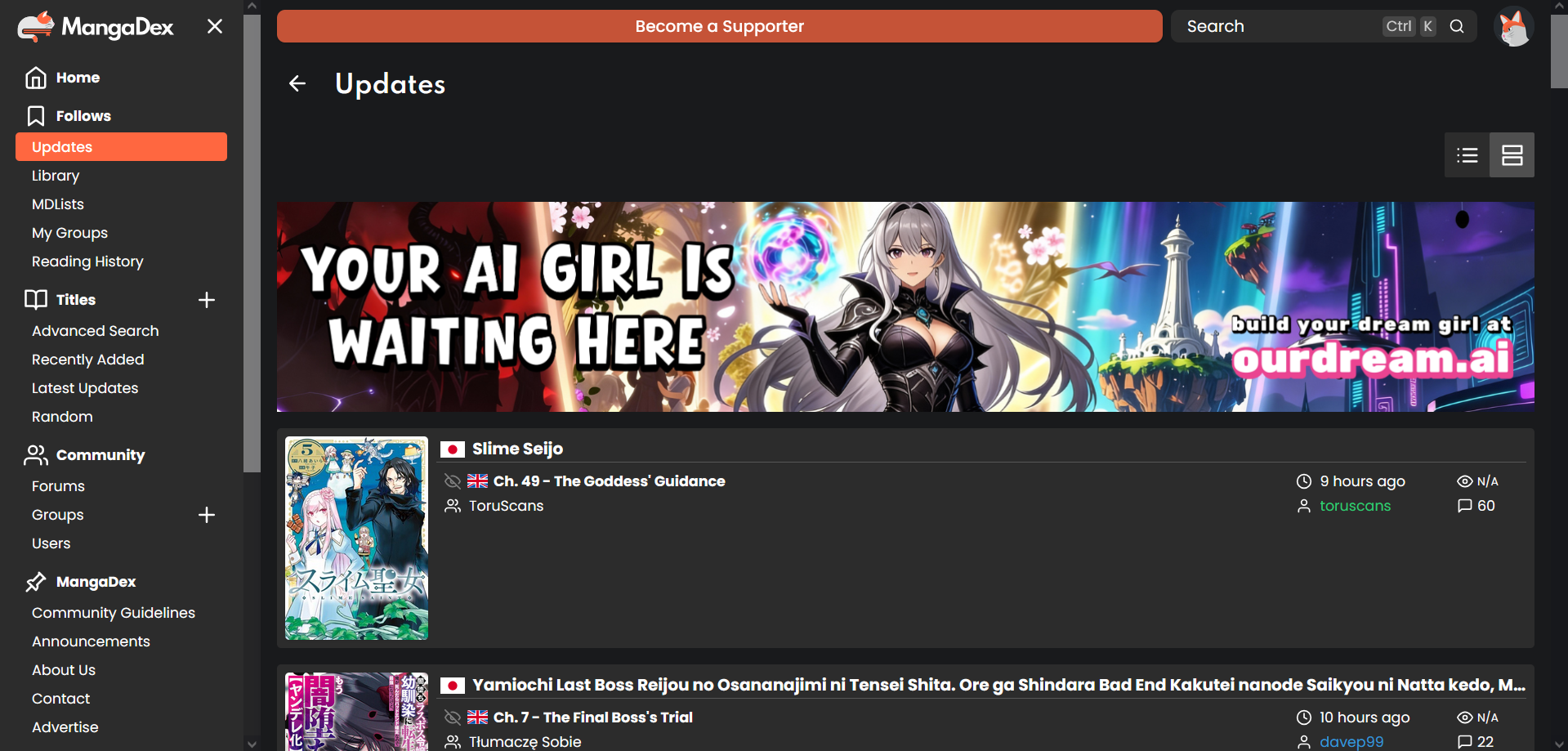 I'd prefer a banner ad to their intrusive support mangadex pop up but i guess they do both now?