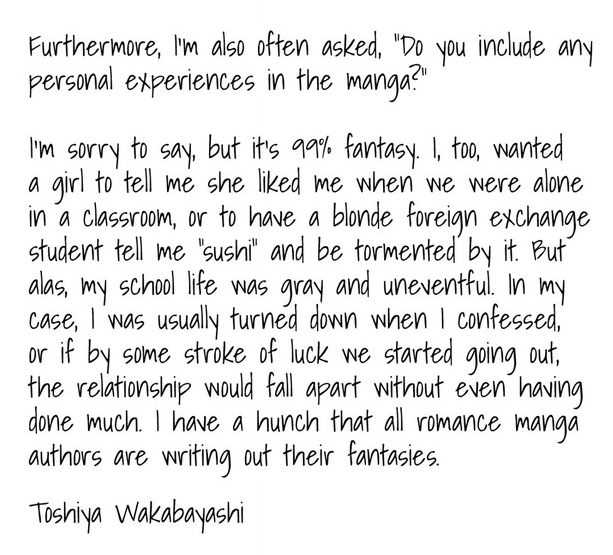 >>285241877Nothing stops an author with "experience" from writing idealistic romance.Hackaka is a divorced dude, and Kaguya was quite the "dragged-on will-they-won't-they bullshit that never happens in real life" manga.It's fiction. It doesn't have to be realistic.