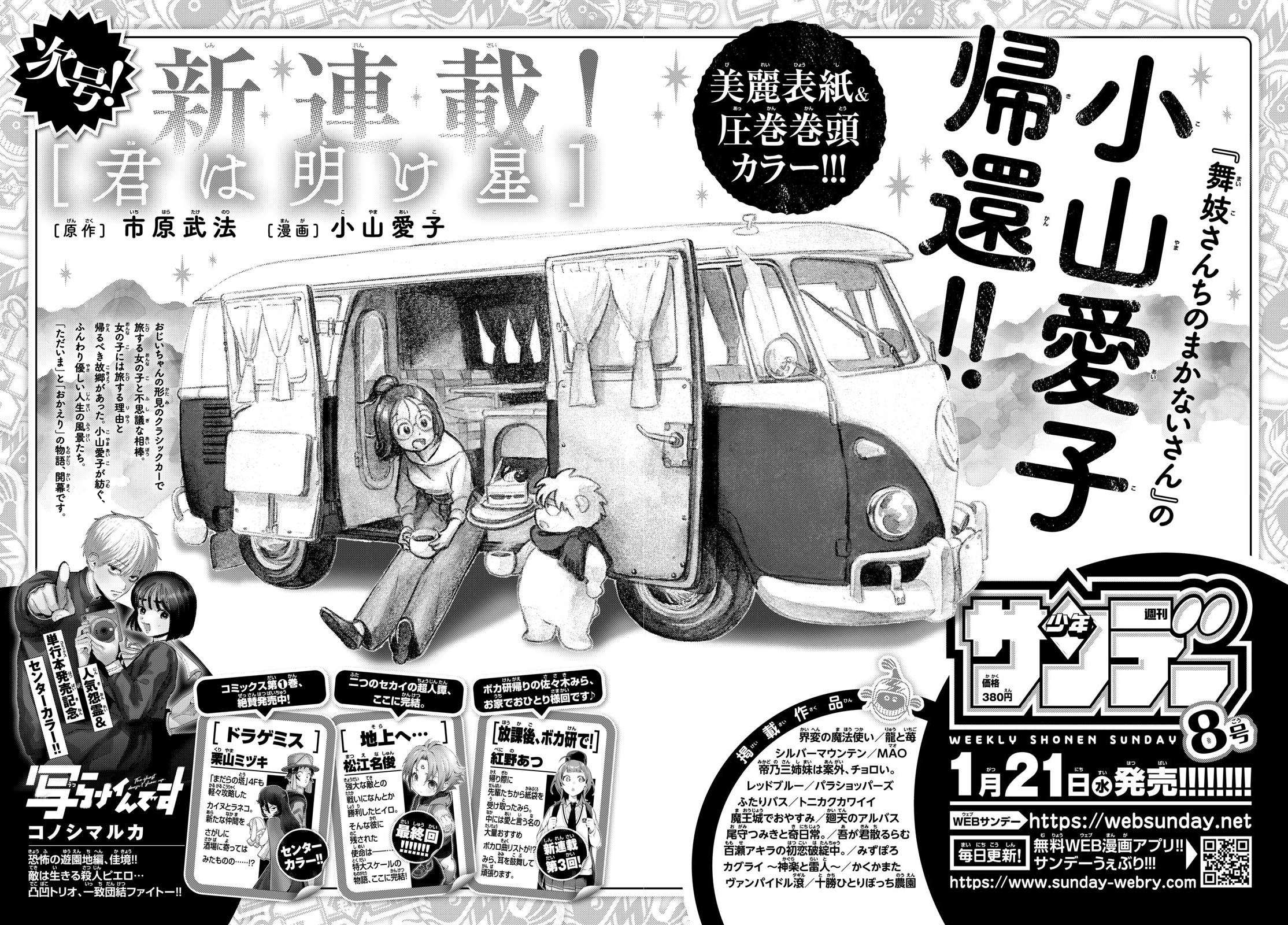TOC for issue #7, 2026Aga Kimi Chiruramu (Shihi Shi, Yuki Tsukikoshi) ch 10Dragemis (Mizuki Kuriyama) ch 14Futari Bus (Sakane Toyobayashi) ch 14Hokago, Voca-Ken de! (Atsu Benino) ch 4 & 5Kagurai - Kagura and Raito (Lettuce Tarou, Mashu Tarou) ch 31Kaihen no Mahoutsukai (Yellow Tanabe) ch 32Kakukamata (Yuhei Kusakabe) ch 37MAO (Rumiko Takahashi) ch 305Maoujou de Oyasumi (Kagiji Kumanomata) ch 426Major 2nd (Takuya Mitsuda) ch 319Mikadono Sanshimai wa Angai, Choroi (Aya Hirakawa) ch 189Momose Akira no Hatsukoi Hatanchuu (Shinta Harukawa) ch 67Ogami Tsumiki to Ki Nichijou (Miyu Morishita) ch 86Parashoppers (Tsubasa Fukuchi) ch 47Red Blue (Atsushi Namikiri) ch 179Ryu to Ichigo (Mitsuharu Yanamoto) ch 271Shibuya Near Family (Koji Kumeta) ch 152Silver Mountain (Kazuhiro Fujita) ch 30Sora e… (Shun Matsuena) ch 49Tokachi Hitoribocchi Nouen (Yuji Yokoyama) ch 381Utsuranain desu (Konoshimadesu) ch 83Vampidol Tagiru (Kazuhiko Shimamoto) ch 34No Conan, Frieren, Aozakura, Albus, Mizu Polo, or Tonikaku.This week's question: "Please tell me about some winter songs that you like to listen to during the winter!"