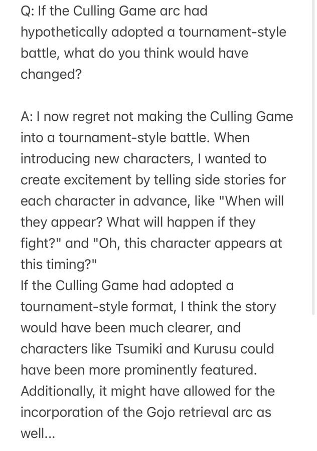 >>285284569Tournament arcs like the dark tournaments usually have down time between matches and peanut gallery encouraging their friends on the sidelines.So that helps with character interactions since everyone is in one place. Though I don't see how gege would implement a more standard tournament and keep everything that happens after the same for the most part.