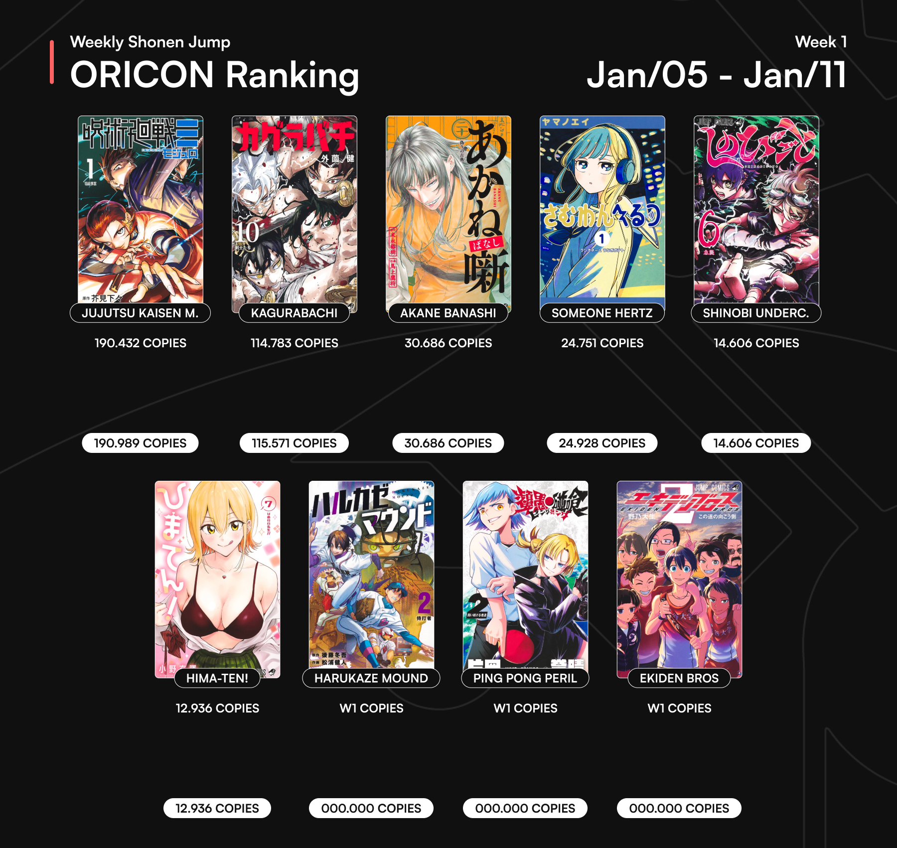 Weekly Oricon Top 50 (1/5/26 - 1/11/26) 1. Jujutsu Kaisen Modulo #1 (190,989) 2. Kagurabachi #10 (115,571) 8. Akane-banashi #20 (30,686) 11. Someone Hertz #1 (24,928) 26. Shinobi Undercover #6 (14,606) 33. Hima-Ten! #7 (12,936) 1. Jujutsu Kaisen Modulo: 190,432 2. Kagurabachi: 132,488 7. Jujutsu Kaisen: 56,988