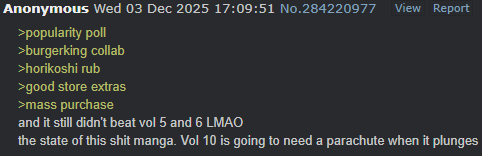 >>285293658DDD's numbers don't make sense to me. The adaptation is very good and has tons of fans. How are they not translating to manga fans?