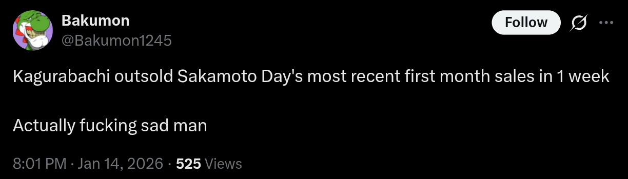 >>285293658>shitting on Blue Box and Sakamoto Days FMs in 1 weekNo wonder they got pushed back for Kagurabachi to take the front spot
