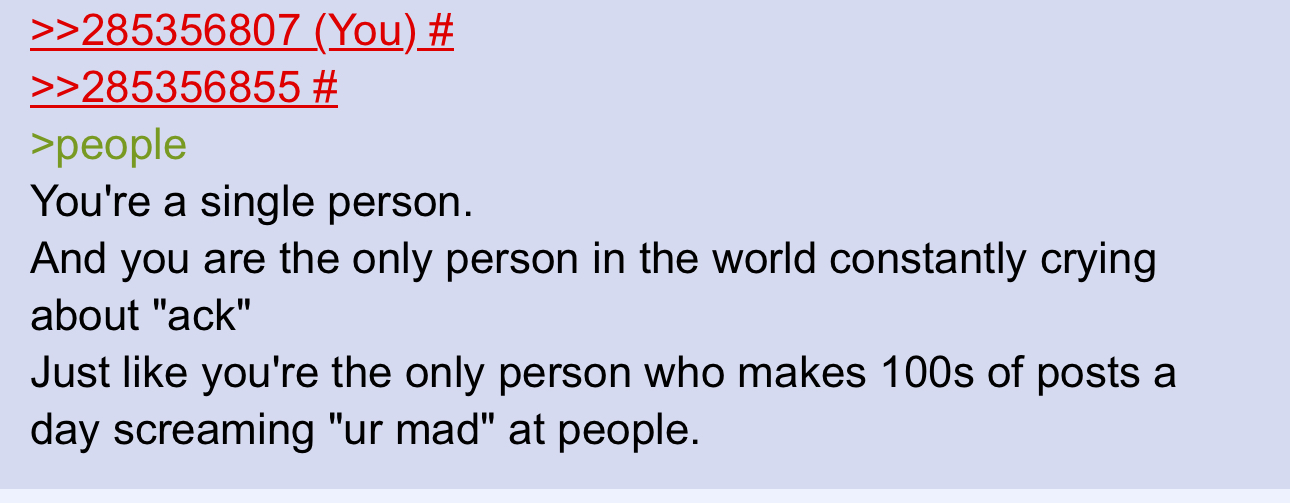 >>285354117When was the last day of your life you didn't obsessively spam "ur mad" at people?