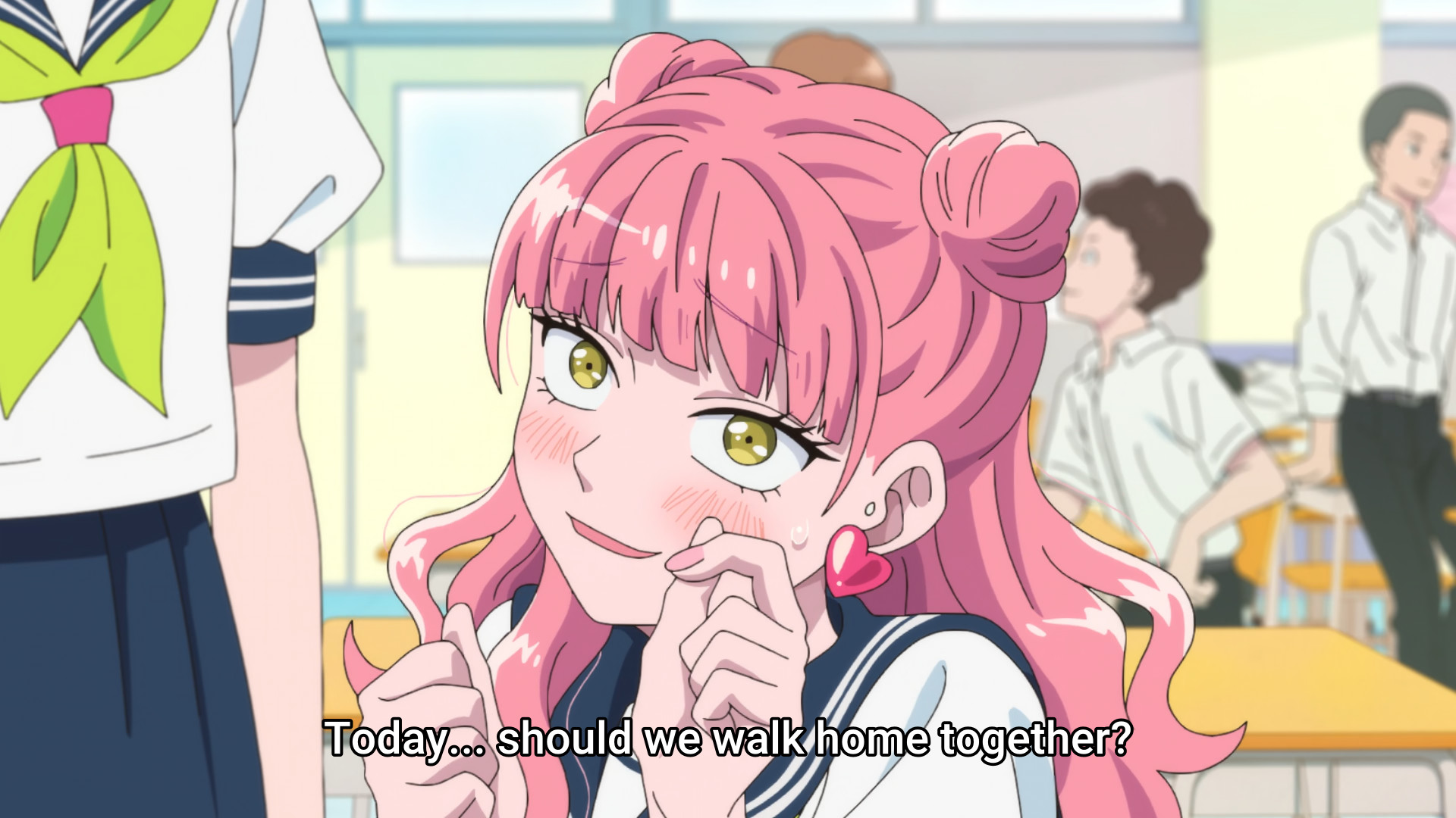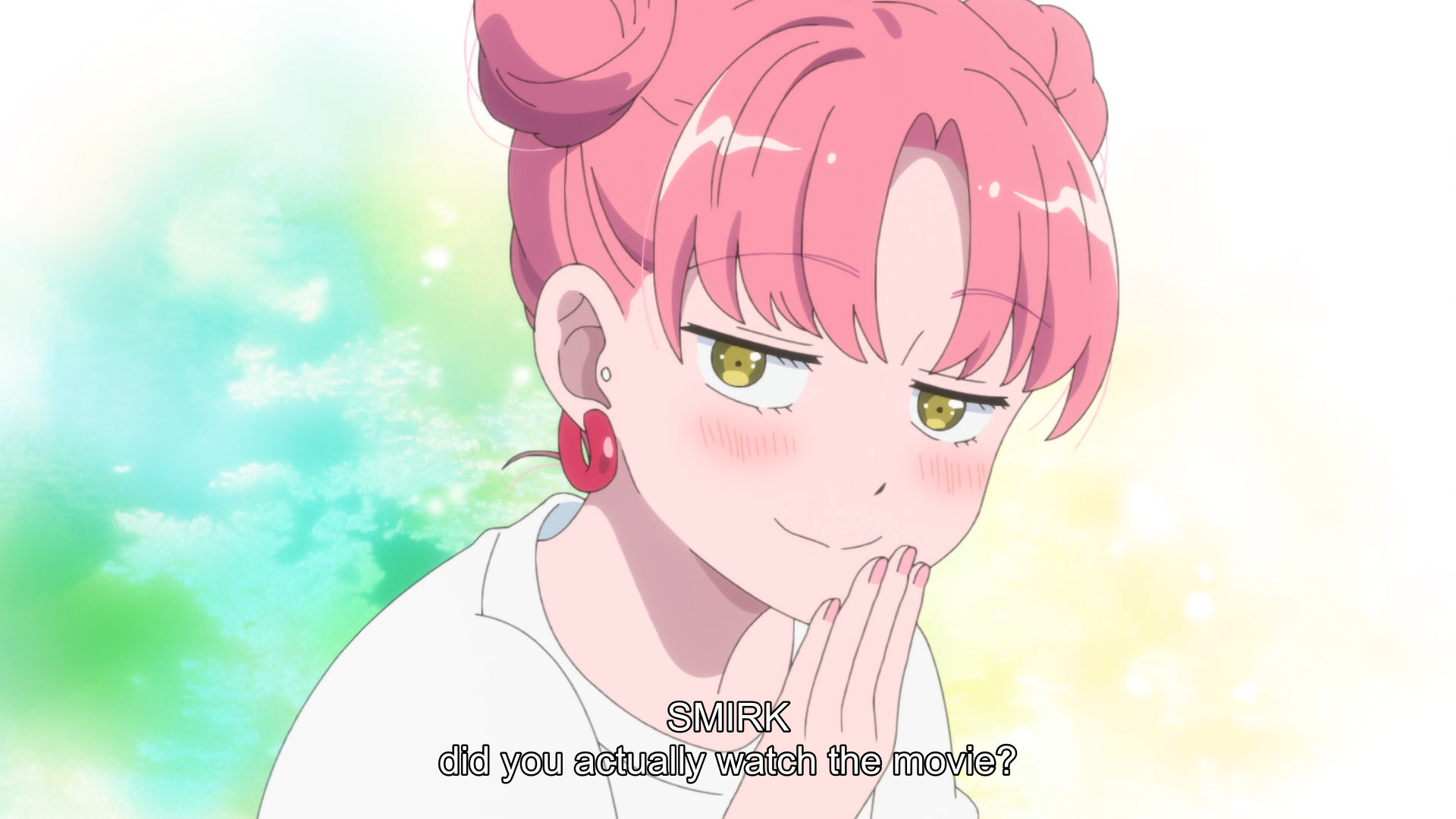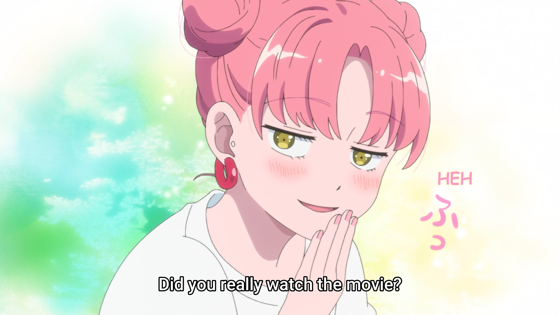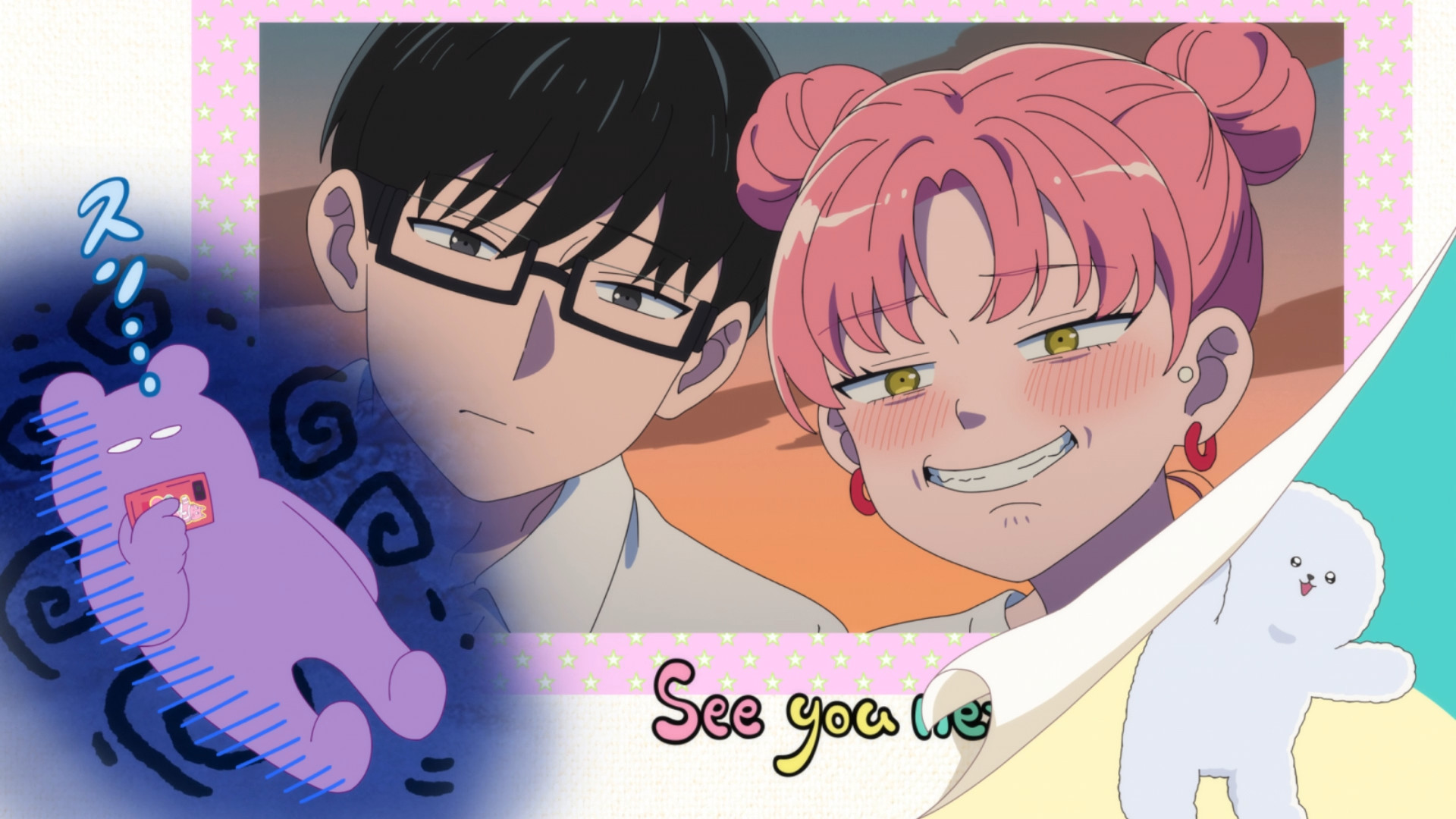 I wonder if it was the mangaka providing the voice of the cat.Pink sure is a cute dork.What a cute dork, now that he's looking at her she can't talk like she used to.Nice how straight forward he is.That's why you clear your history.Damn, thought he was going to kiss her for a second.So he wears a fanny pack across his chest? Is that a thing now?Cute daito.Cute dork crying at the movie.Cute pink using the same line on him. These two are great.Lewd hand holding. Lol, another terrible picture.This is a great show. Both of them are cute dorks in love.