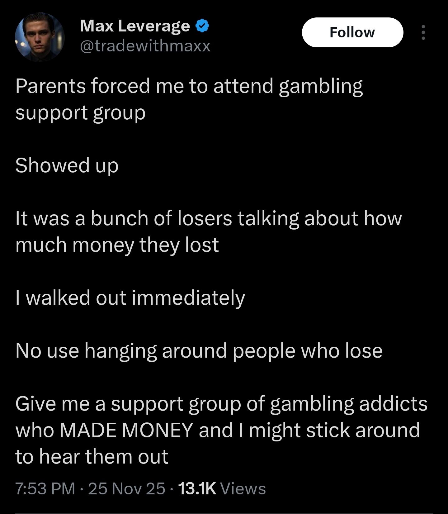 >>285397260>studied various financial investments and speculative industries>lost all his money gamblingLMAO
