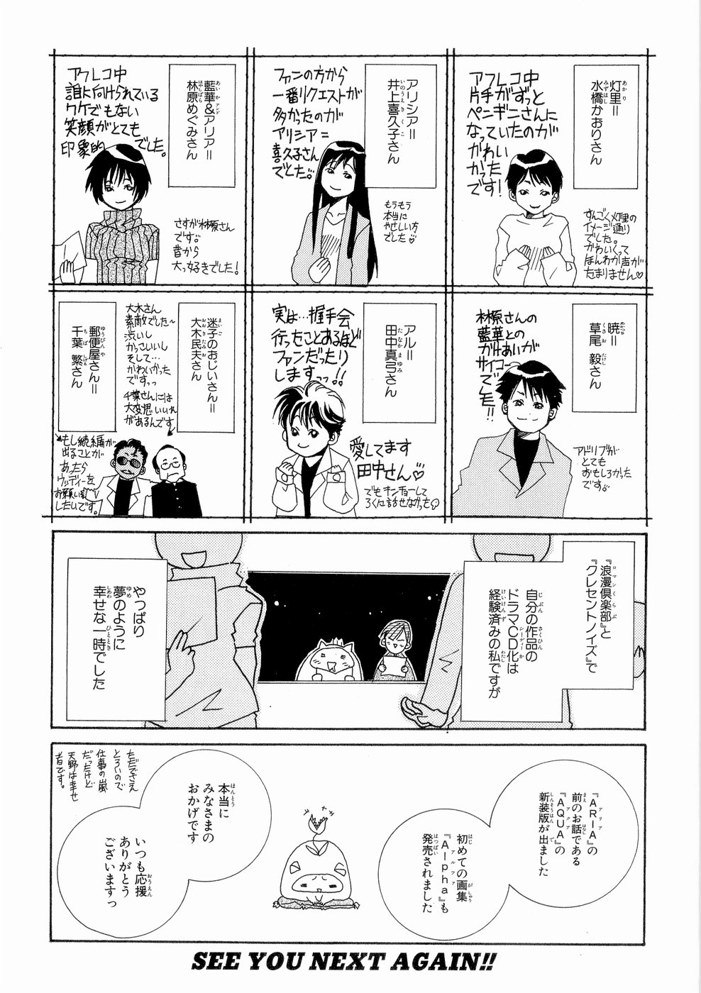 >>285408734>>285406457words words wordsAkari: Mizuhashi KaoriShe spend the whole recording session with her hands like a penguin's. It was cute!I just can't withstand that warm, fuzzy voice of hers <3Alicia: Inoue KikukoHaving her as Alicia was far and away the most common request from fans.She really is such a gentle person <3Aika and Aria: Hayashibara MegumiHer smile, though not towards anyone in particular, was truly striking.That's Hayashibara-san for you. I've loved her since a while back!Akatsuki: Kusao TakeshiHis part with Hayashibara's Aika was the best!His adlibs were really funny.Al: Tanaka MayumiThe truth is... I'm such a fan of his that I went to a handshake event!I love you, Tanaka-san!!!(But I was so nervous that I couldn't really chat with him)Lost old man: Ooki TamioOoki-san was wonderful~. He was sour, he was cool... He was even cute. He got along really well with Chiba-san.Postman: Chiba ShigeruI'd like to ask him to play Woody if another CD gets made.I've experienced having my own works adapted by Roman Club and Crescent Noise before, butIt really is a dreamlike kind of happiness, in that moment.The story before Aria, Aqua, is getting a new printing.And my very first art collection, Alpha, is now on sale.It's thanks to all of you. Thank you all for always cheering me on.I'm slow at the best of times and work just keeps piling up, but I'm still happy.