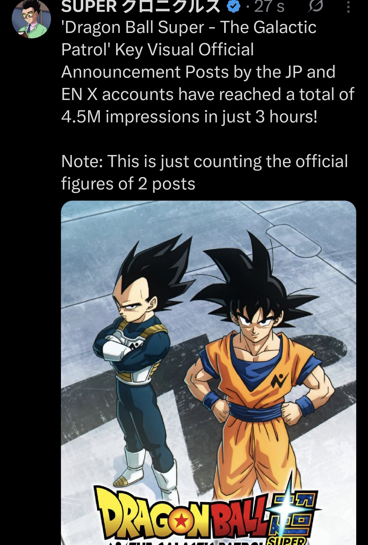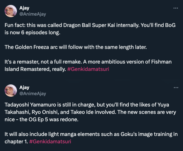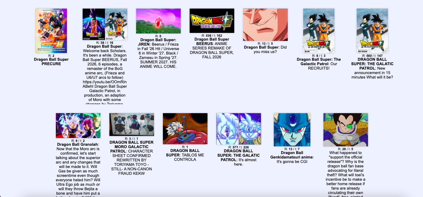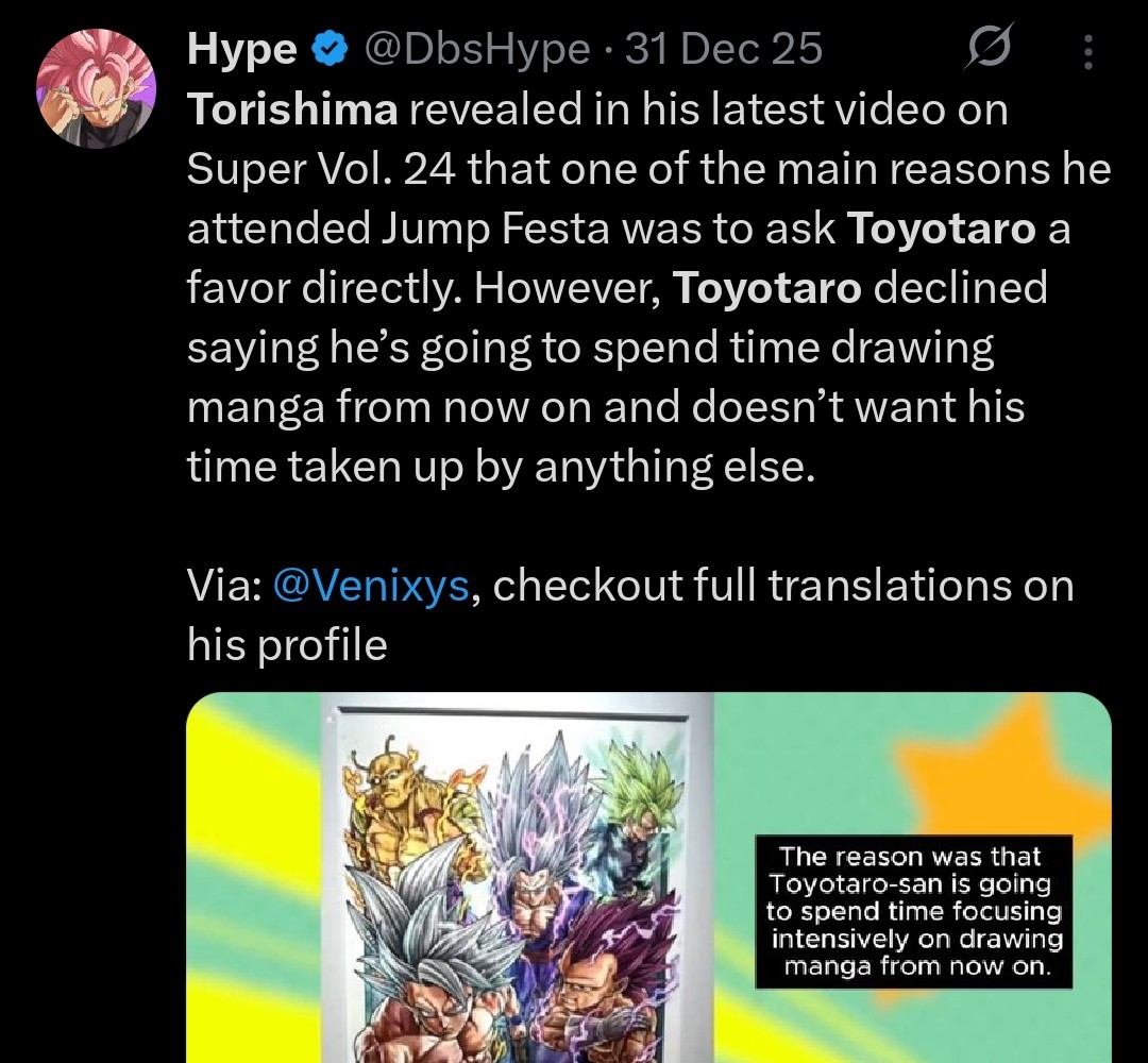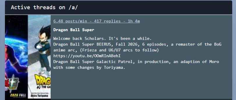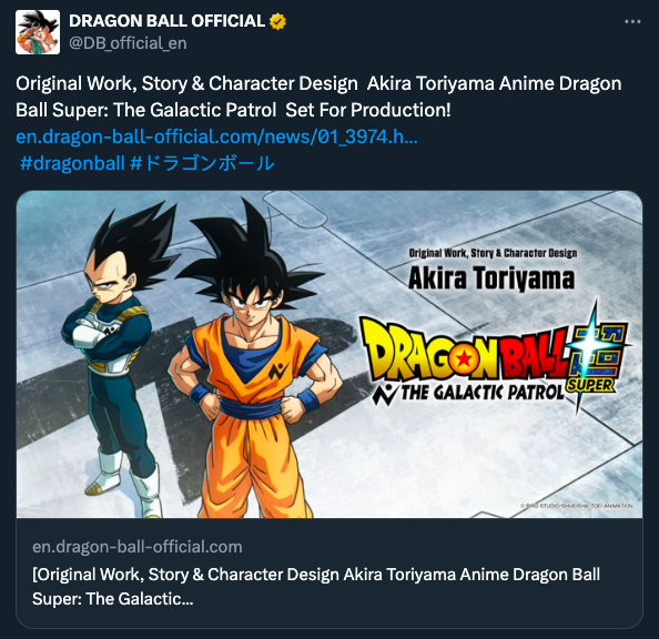 Welcome back Scholars. It's been a while.Dragon Ball Super BEERUS, Fall 2026, 6 episodes, a remaster of the BoG anime arc, (Frieza and U6/U7 arcs to follow)https://youtu.be/OOmRInABehIDragon Ball Super Galactic Patrol, in production, an adaption of Moro with some changes by Toriyama.