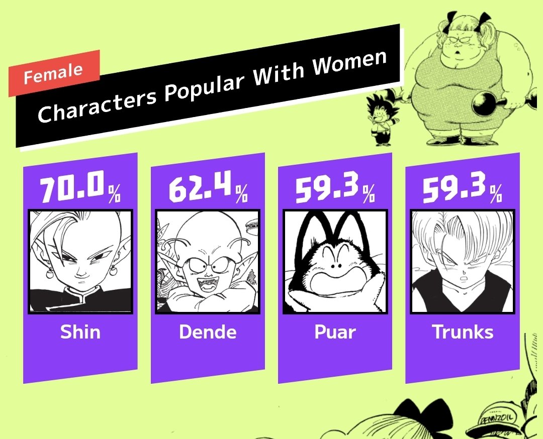 >Votes>Overall#21 - Raditz#20 - Videl#19 - Launch#18 - Android 17#17 - Chi Chi#16 - Goten#15 - Bulma's family cat#14 - Tenshinhan#13 - Bulma#12 - Yamcha#11 - Krillin#10 - Freeza#9 - Cell#8 - Android 18#7 - Bardock#6 - Future Trunks#5 - Vegetto#4 - Piccolo#3 - Gohan#2 - Vegeta#1 - Goku>Votes>Women>Age 10 and under5. Bulma's Family Cat4. Android 183. Tenshinhan2. Vegeta1. Goku