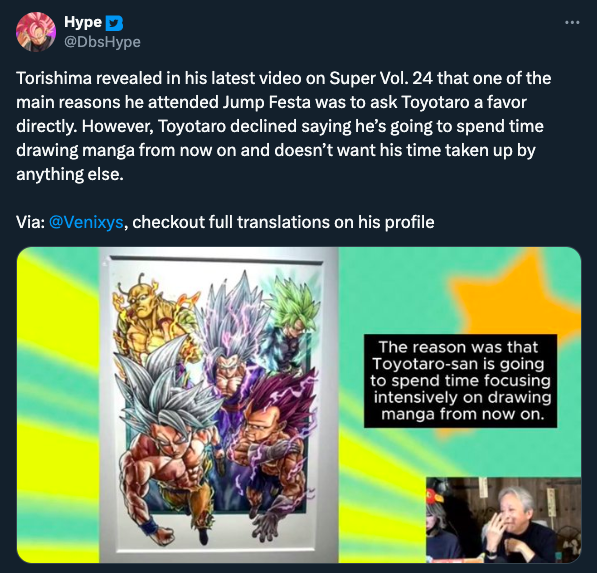 To never stop improving is the core theme of ALL of Dragon Ball.So what if he has no talent?So what if he has no wife or kids?So what if he spent most of his career on someone else's story and will leave no mark of his own?So what if he will never be as good as his predecesorSo what if he will never be credited for his contributions to the franchise?As long as he's improving, Toyotaro and all of us... We're all Dragon Ball!