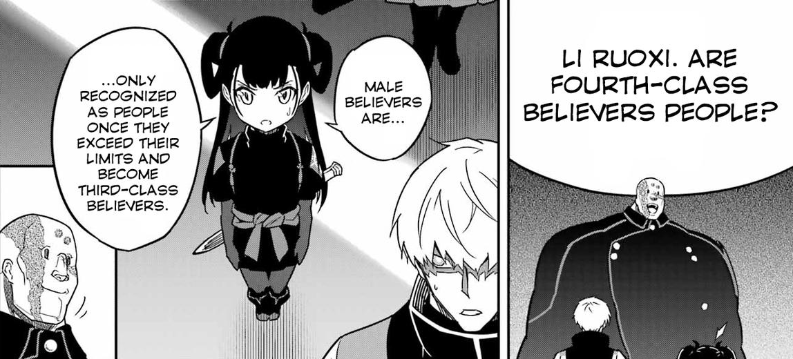 Yeah, no shit. Males don't make more humans but they eat. When the situation is so dire that any human that is incapable of fighting dragons is a literal dead weight threatening the existence of the entire race there are not many options. Sun cult isn't good, it is a hellish place that turns humans into ammo and their corpses into more ammo and yet Cult still doesn't enjoy an abundance of resources and the enemy is simply overwhelming. Even when they ration everything including the right to live they can just barely scrap by. Regardless of that Cult is the only hope humanity has left, all other options ends in some variation of cattle or plain extermination of humanity. This is just how fucked the world is. If you want to blame someone, blame the fucking dragons.